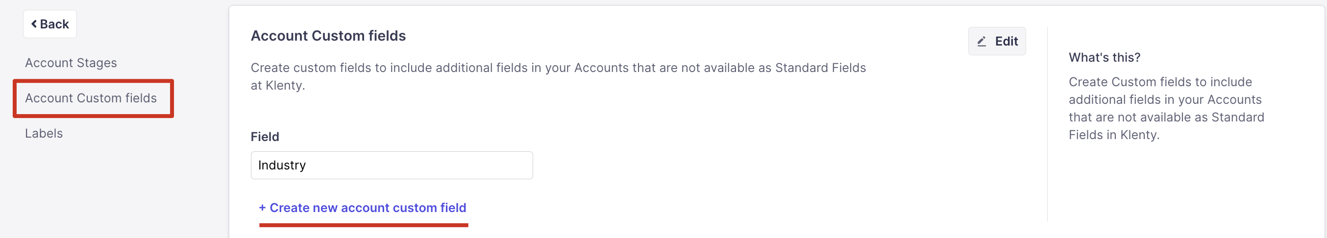 To create an account custom field, please navigate to the Settings Page --> Accounts settings --> Create Account Custom Fields.
