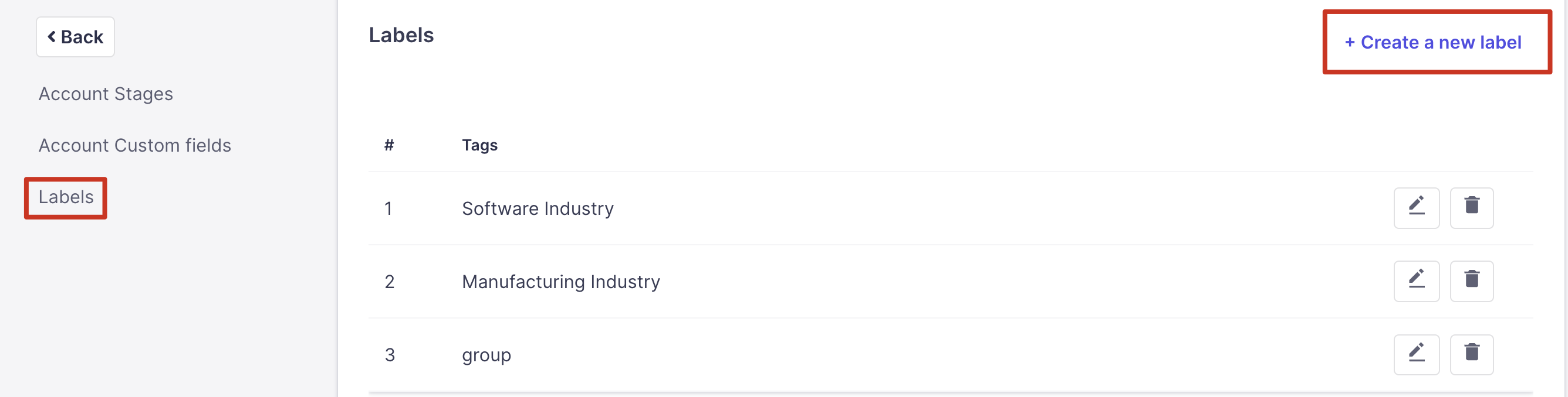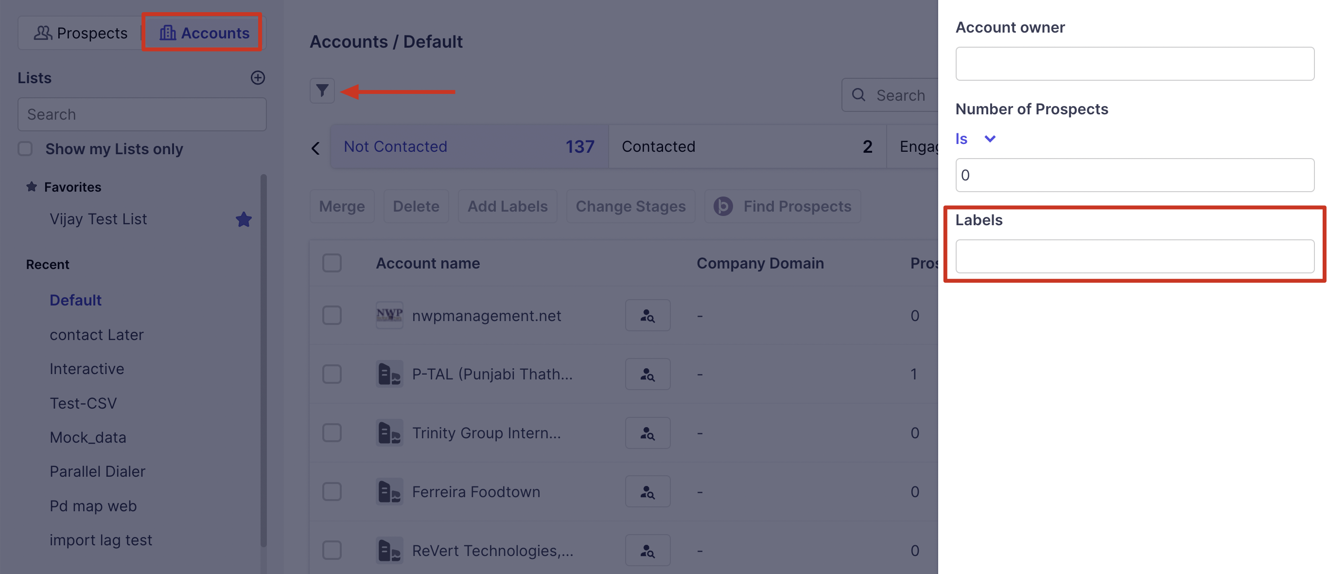 Labels help you organize the accounts created. Adding Labels to your accounts based on the company type, revenue, etc helps you group them and run a targeted cadence.