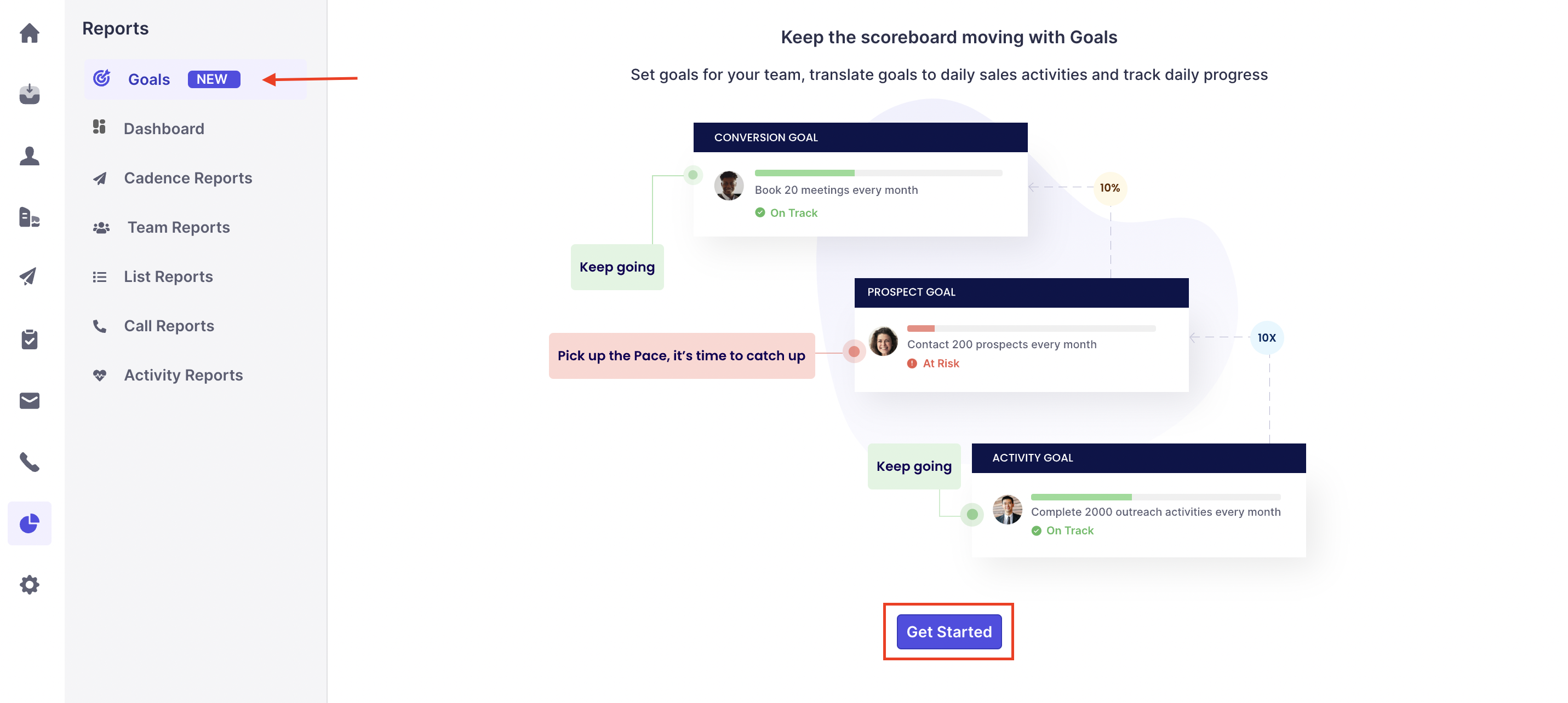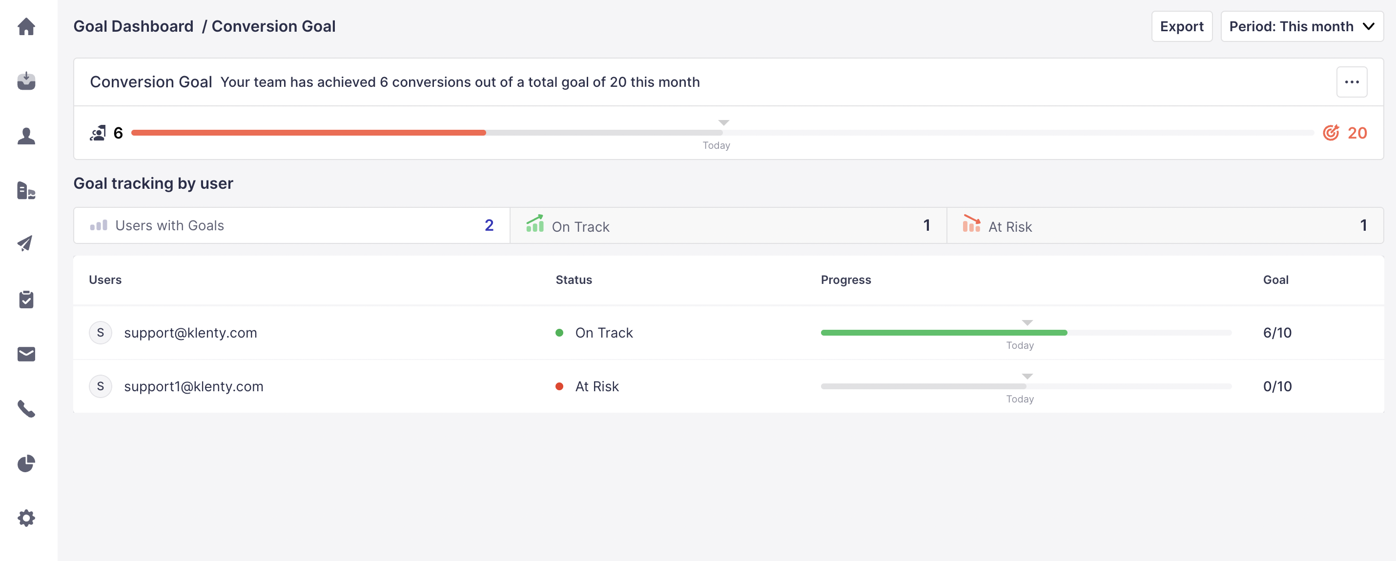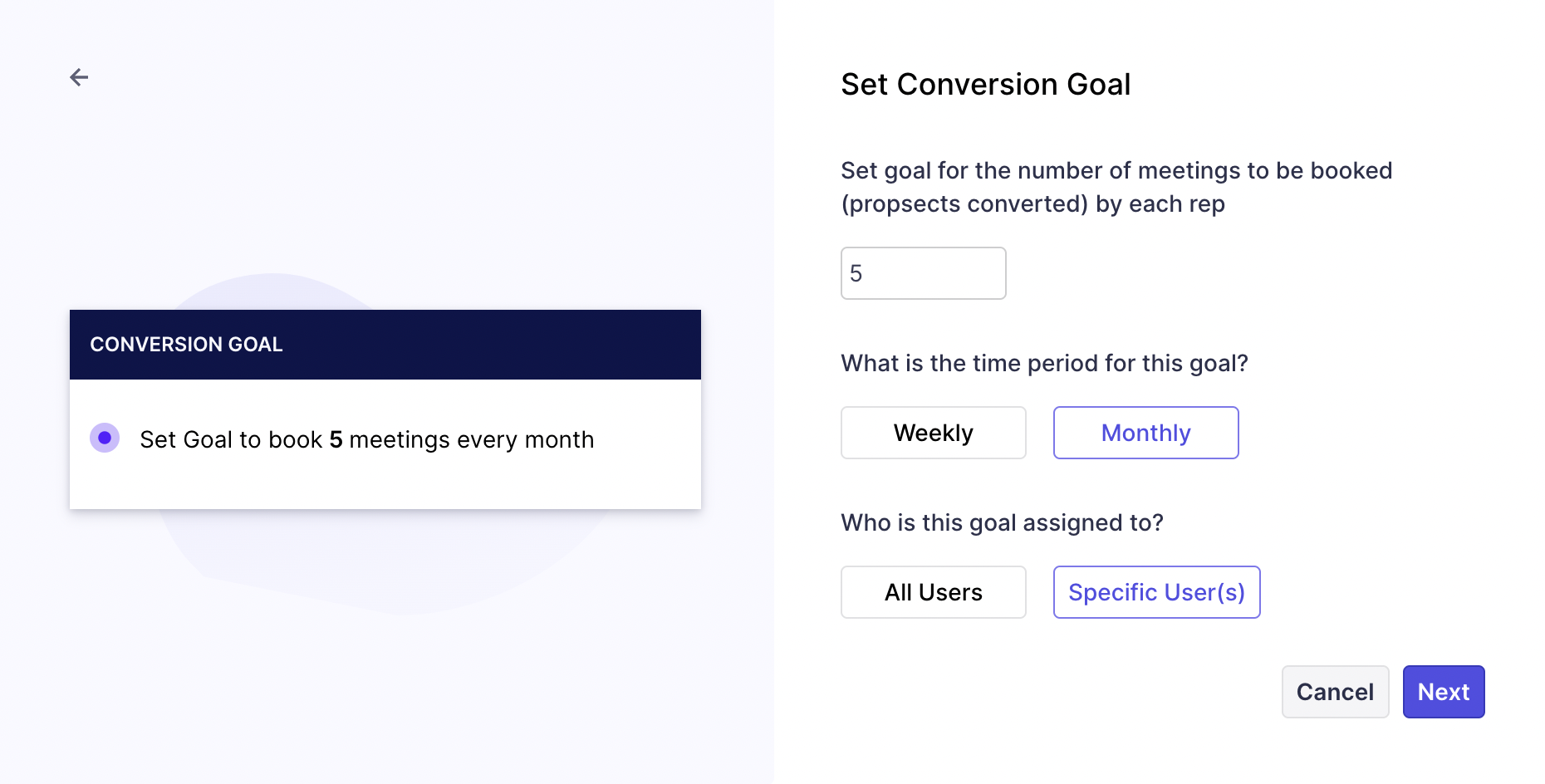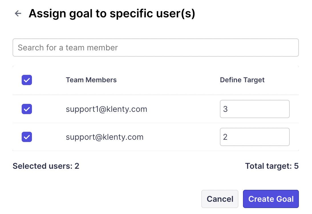Set the details of the goals such as if it is a monthly or a weekly goal, and if the goal is applicable to all users or to specific users. Finally, define the goal target for the users you’ve selected and click on Create Goal