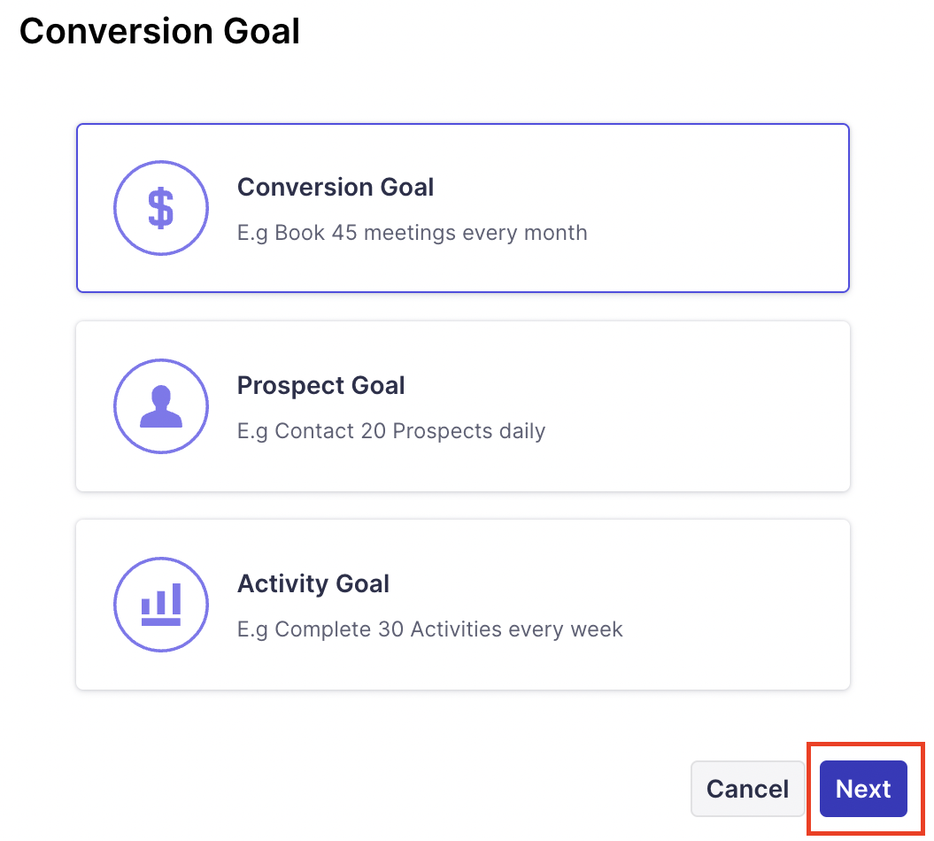 Pick a Goal (Conversion Goal, Contact Goal, or Activity Goal) from the following screen, and click on Next.