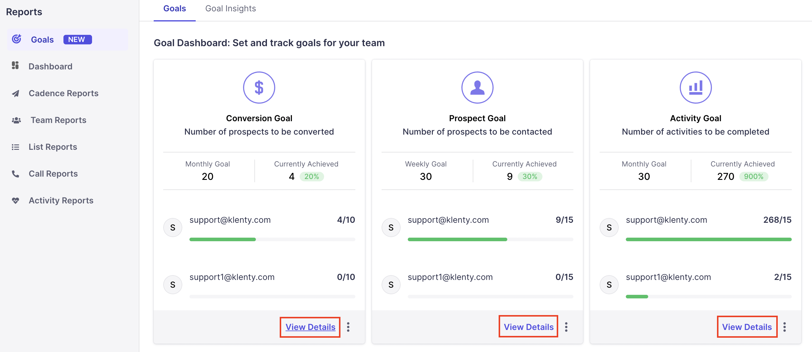 Once the goals are set, you can view the details of three individual Goals by clicking on View Details from the Goals Dashboard.