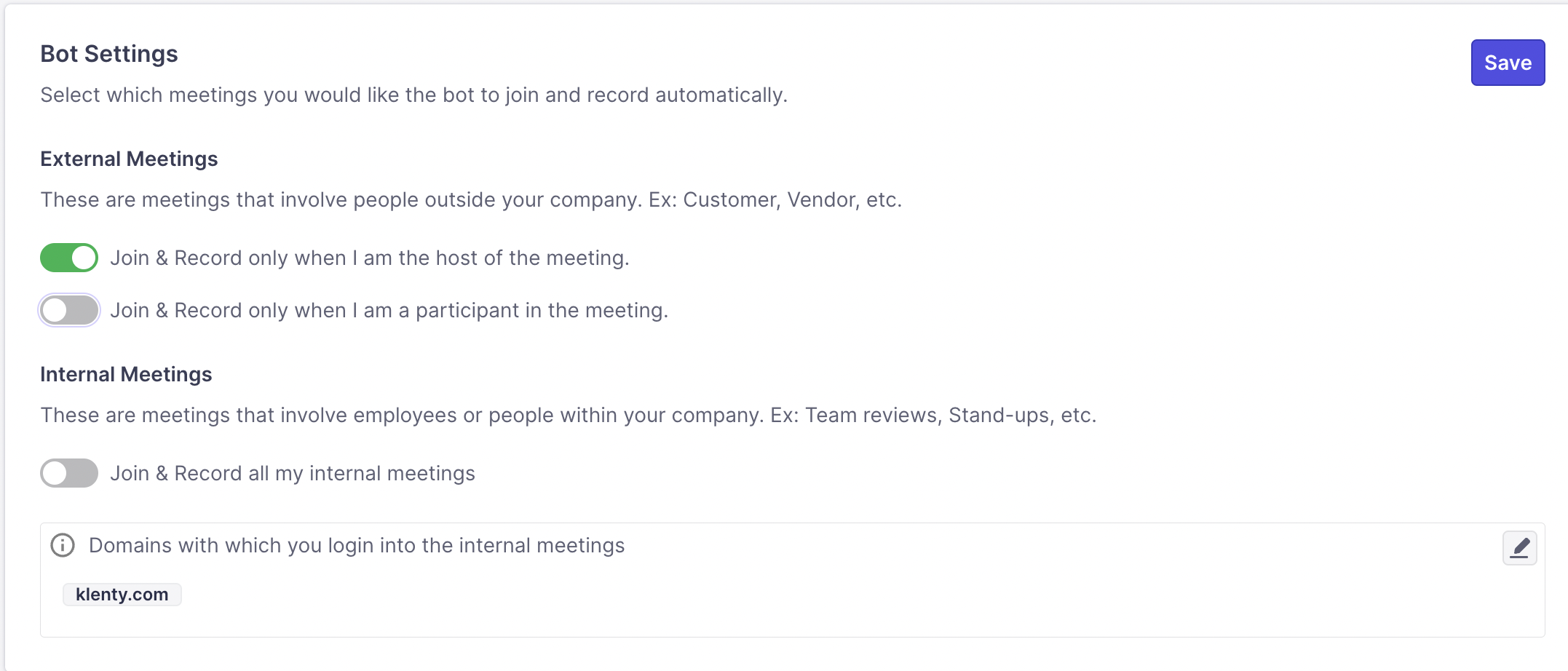 You can also configure if the bot should join internal meetings. Make sure that you mention the domain name that will be used in internal meetings.