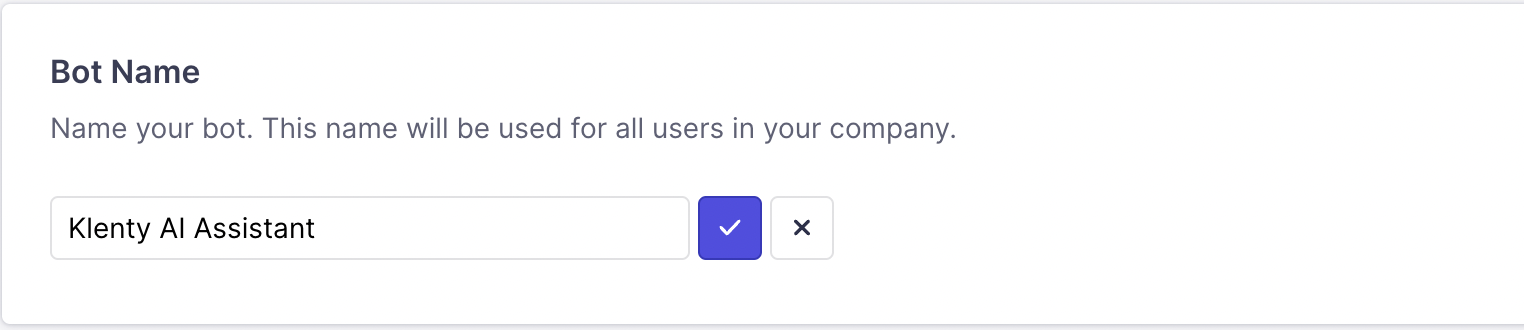 Please note that the same Bot Name will be used for all users in your team. If you update the name, the bot name in your teammate's account will be updated as well
