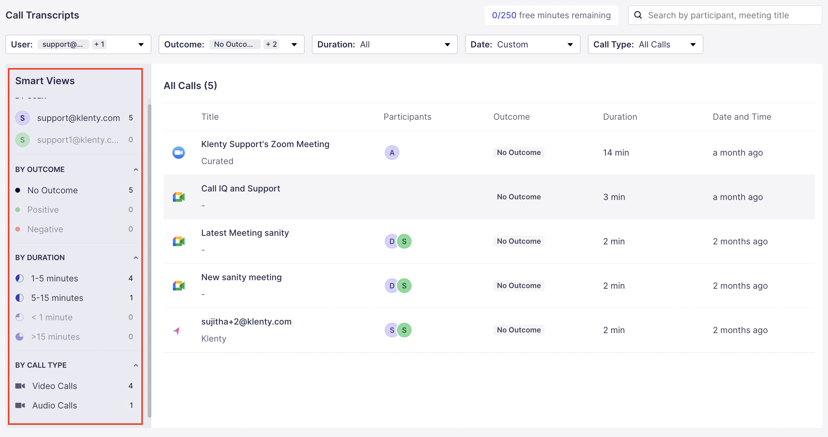 You can view both Audio (via Klenty) and Video (synced from your calendar) calls from this section. Smart Views and filters are available for easy access.