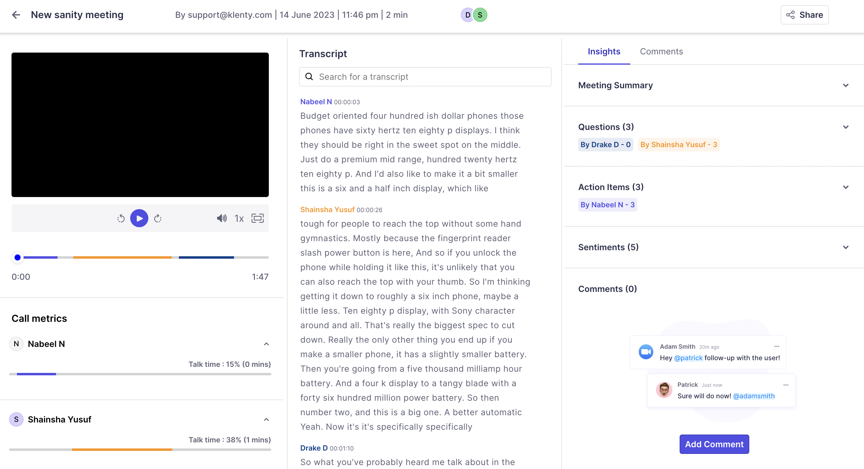 Insights - Meeting summary, Questions, Action items, Sentiment