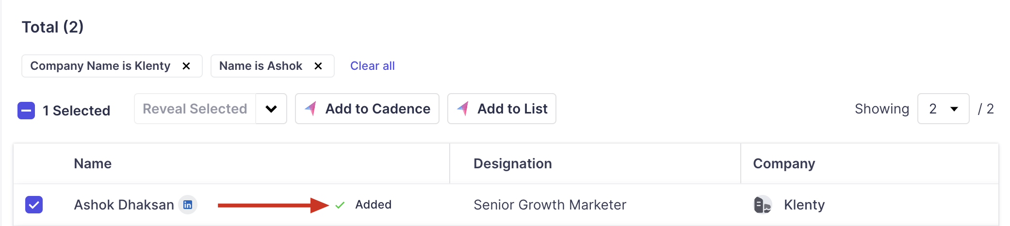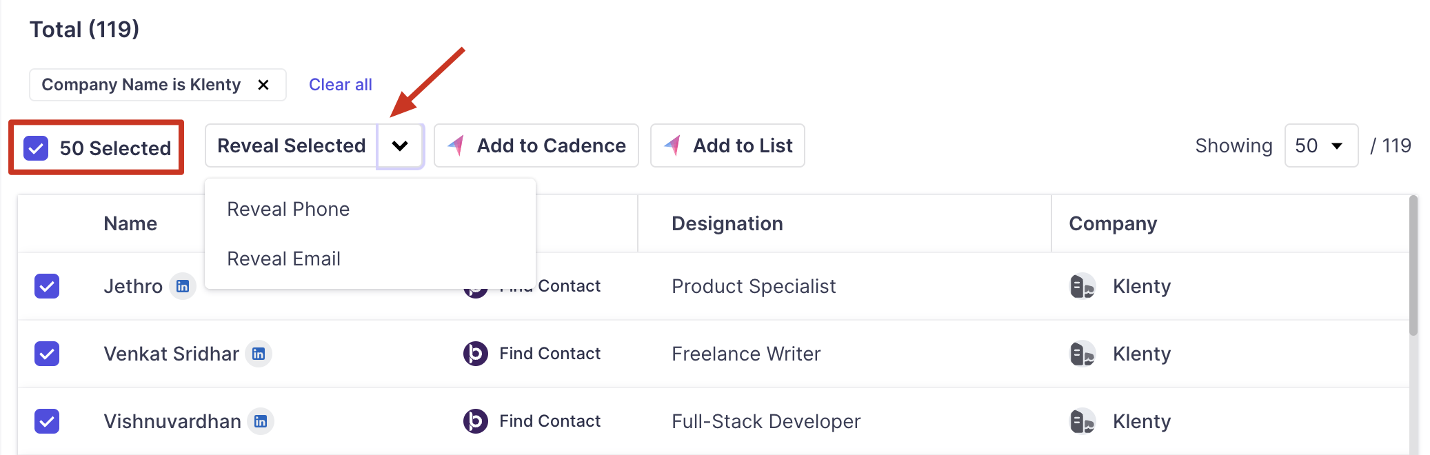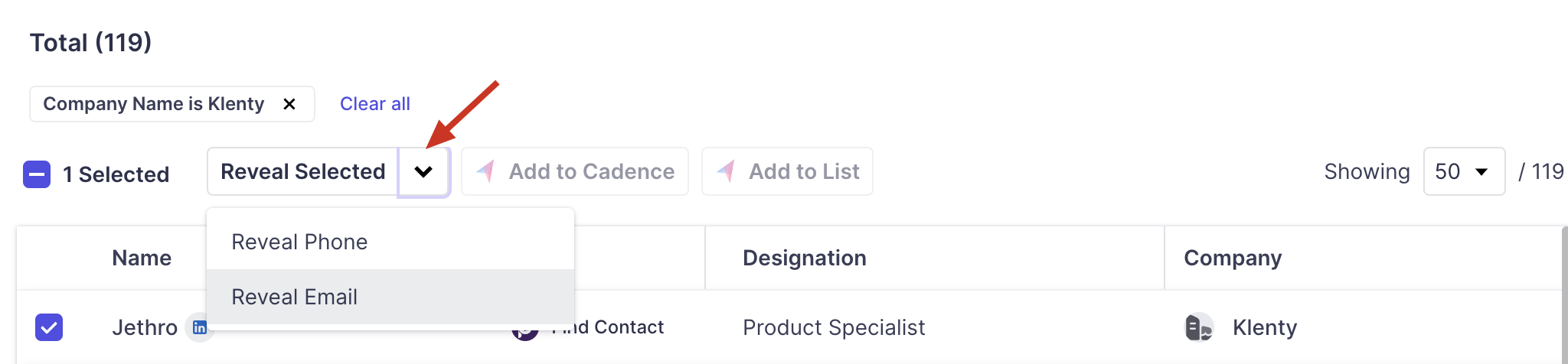 You can reveal the above details for a single contact or in bulk. When the contact is revealed, you will see a success message at the top right.