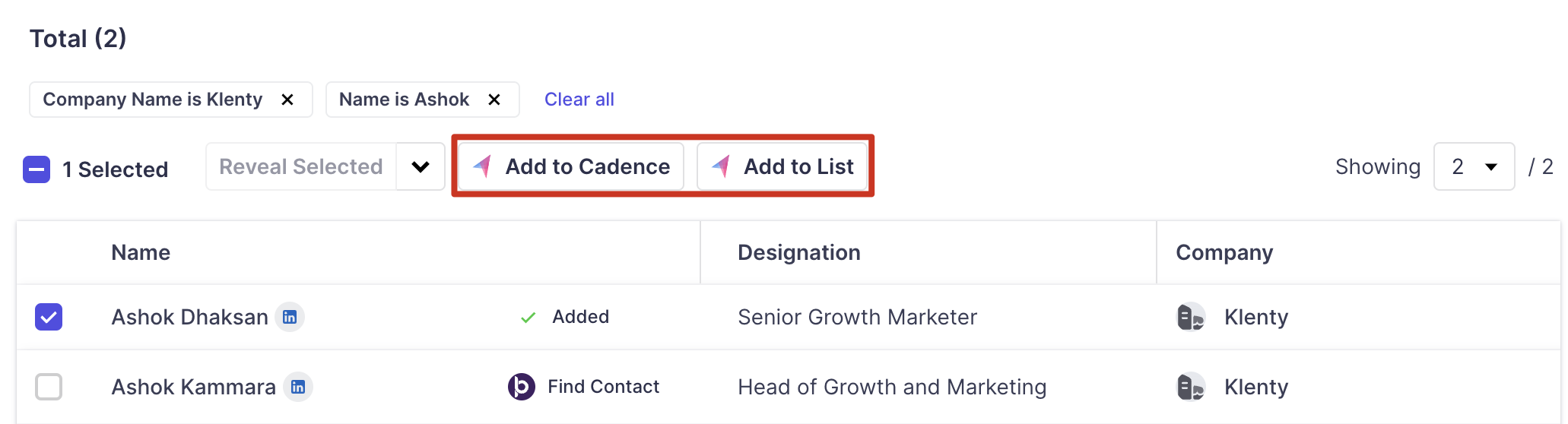 Further, the Add to Cadence and Add to List options are available at the top from where a single Prospect can be included or as Bulk to get to add them to Cadence and to the Prospect list in Klenty.