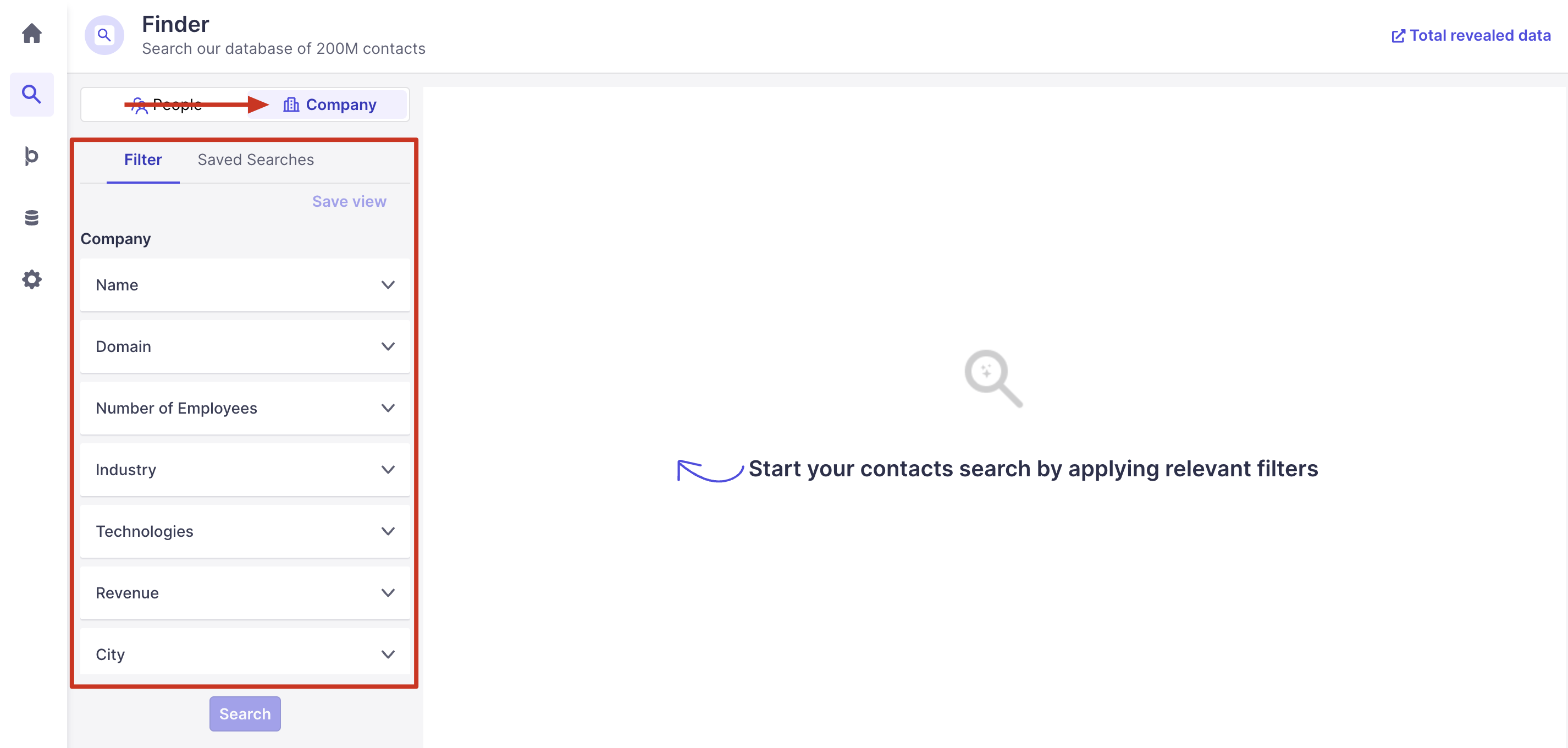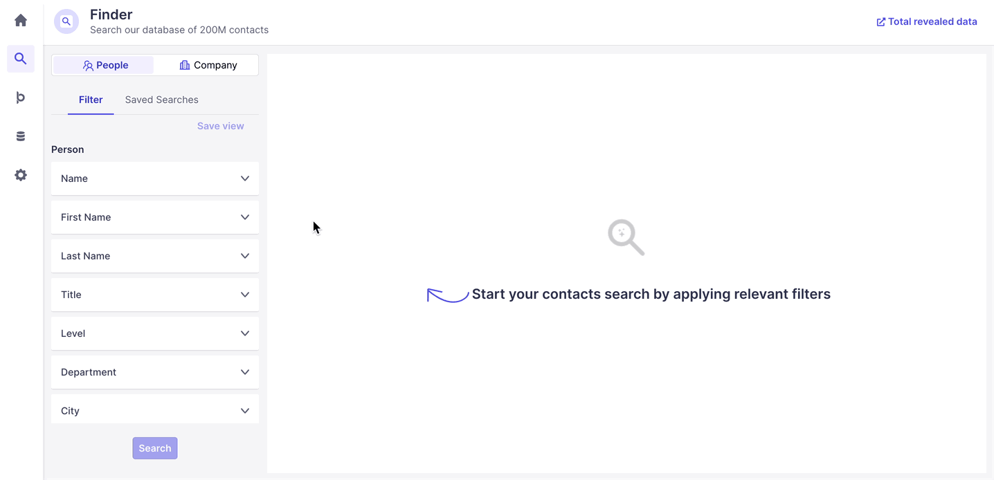 After applying the filters, choose the "Save View" option and provide a name for your view. This save view option is available for both Person and Company search.