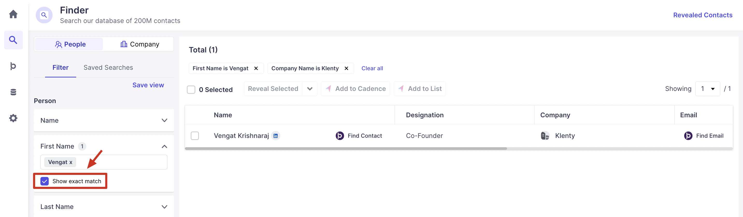 For more accurate results, you can use the Exact Match option available under the Person's First name, Last name, Title, and Company name filters.