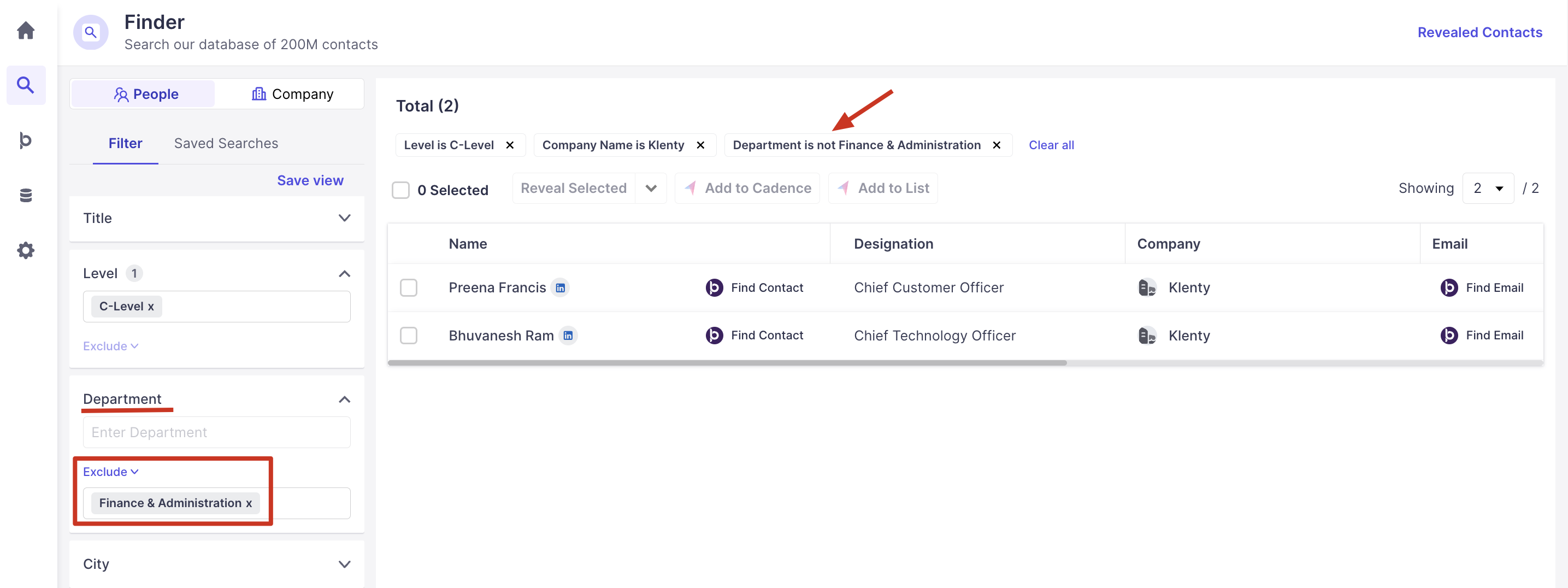 Likewise, the Exclude Option can be used to filter out certain information from search results. This is available under Person's Title, Level, Department, City, Country, State and Under Companies's No. of Employees, Revenue, City, Country, and State Filters.