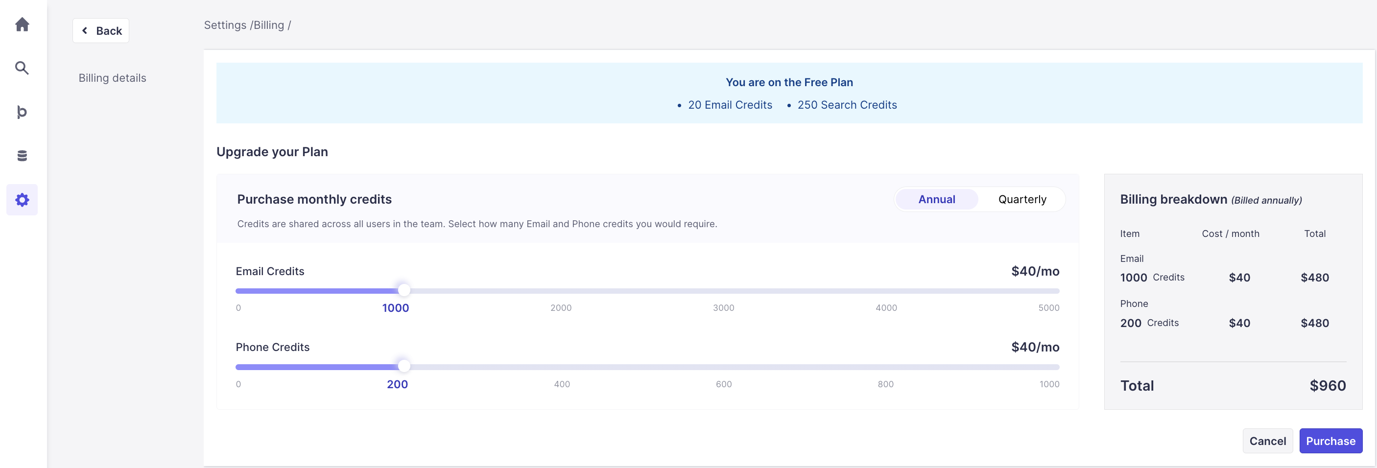 Prospect IQ offers you Quarterly and Annual billing options. Credits are added to your account and will be charged upfront. These credits are non-transferable to the next cycle.