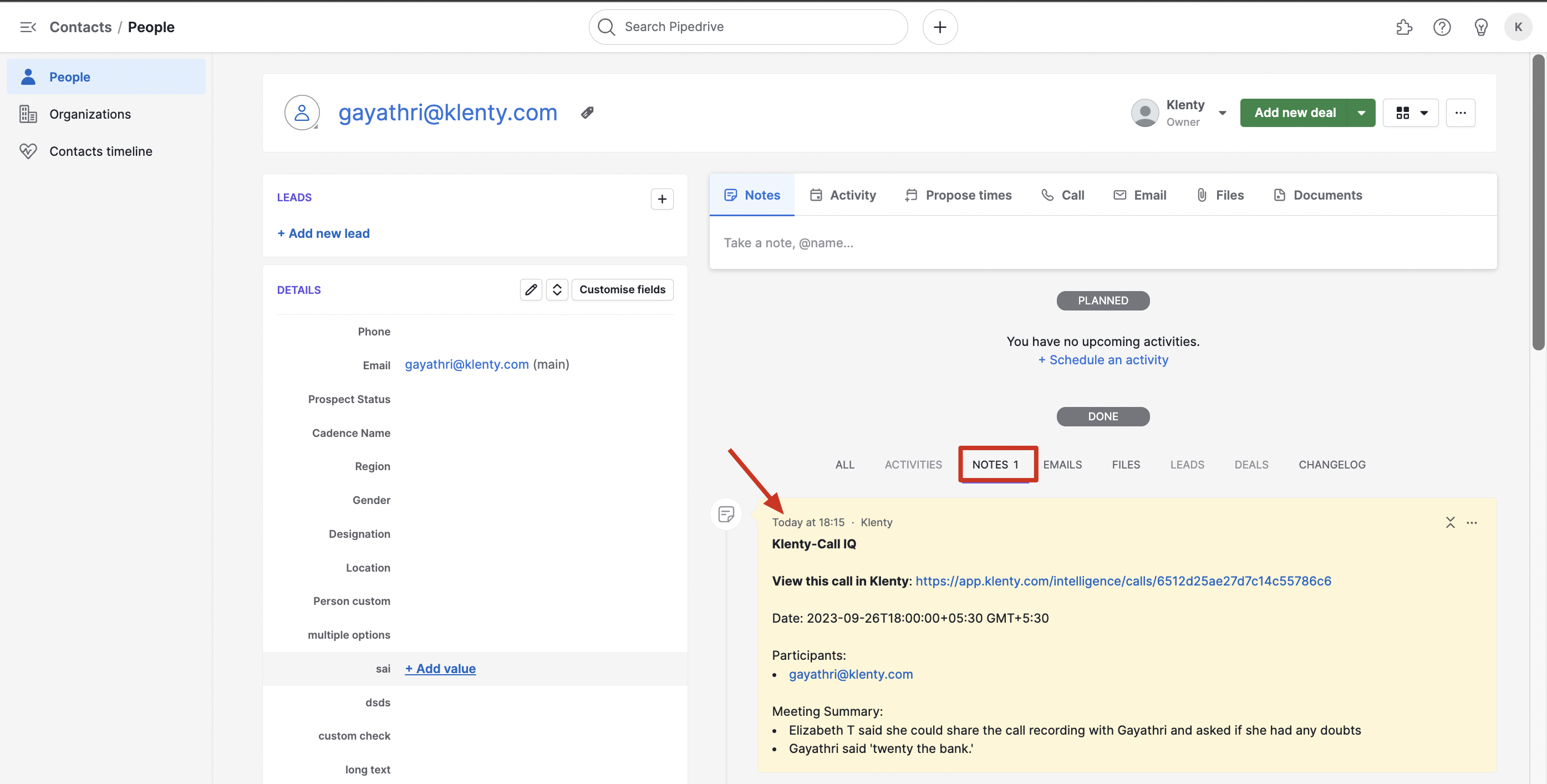 In Pipedrive the call transcript is saved for the Lead/Contact as Notes. The notes would consist of Link for the call transcript, Participants of the Meeting, and the Meeting Summary.