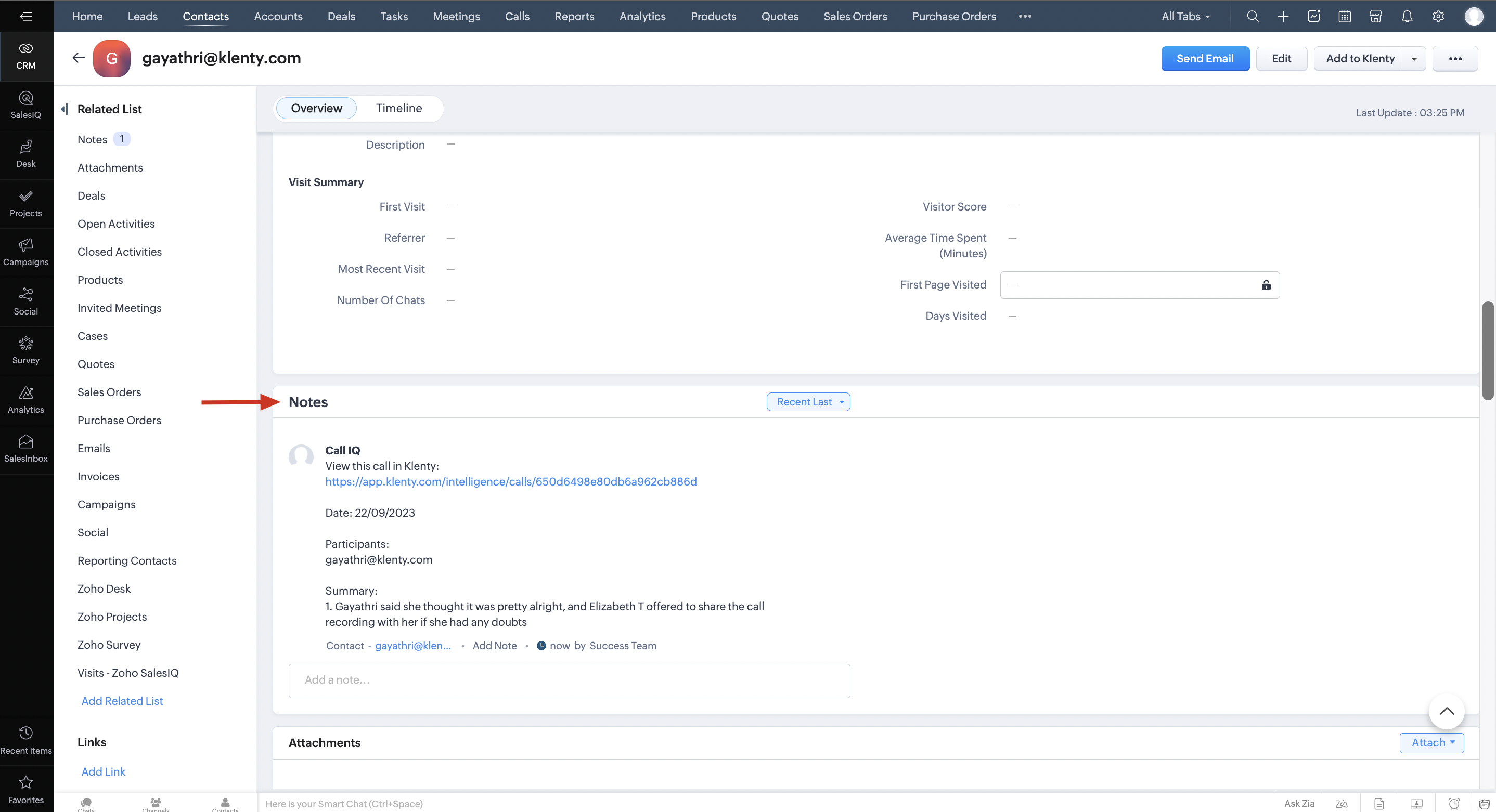 In Zoho, the call transcript is visible under Notes of the Contact as shown below. From where the transcript link can be directed to Call IQ in Klenty.