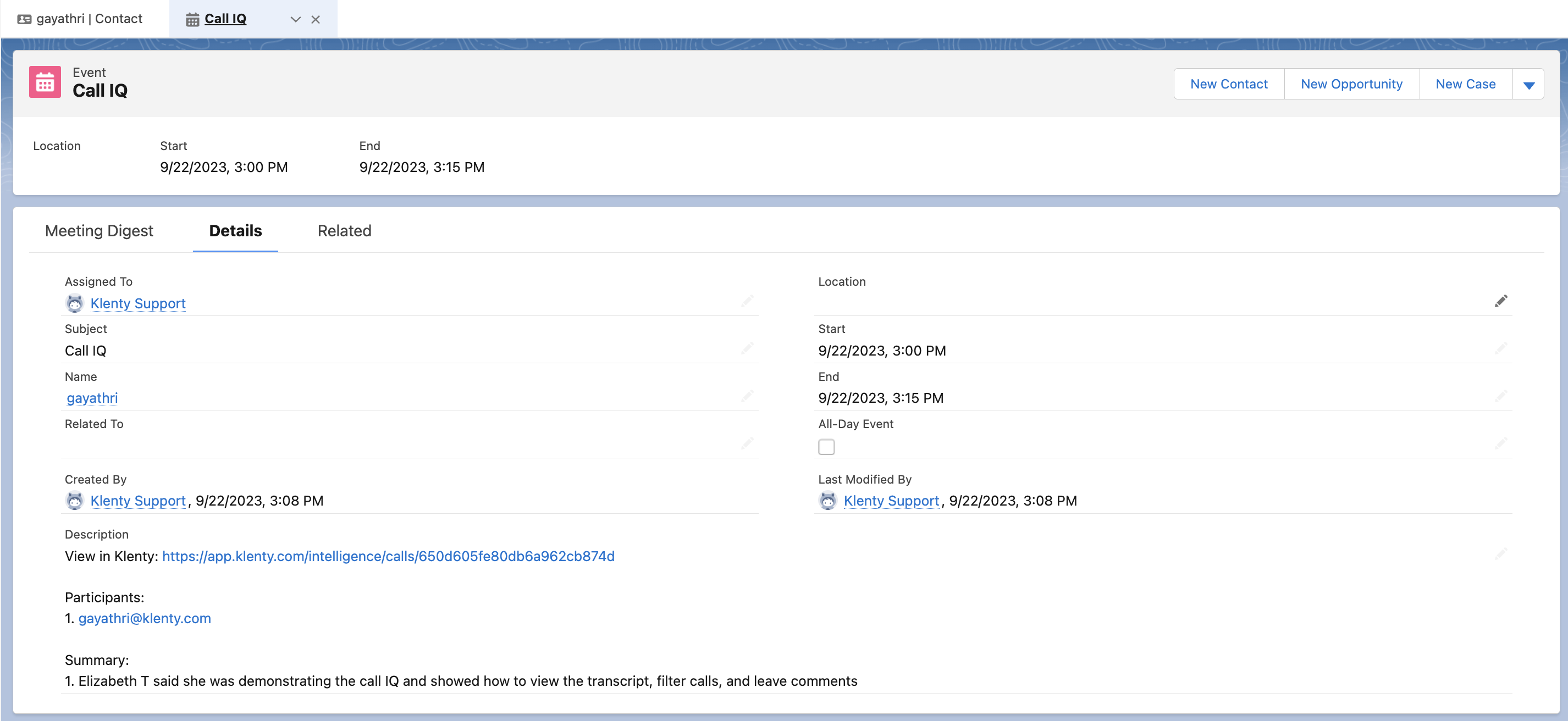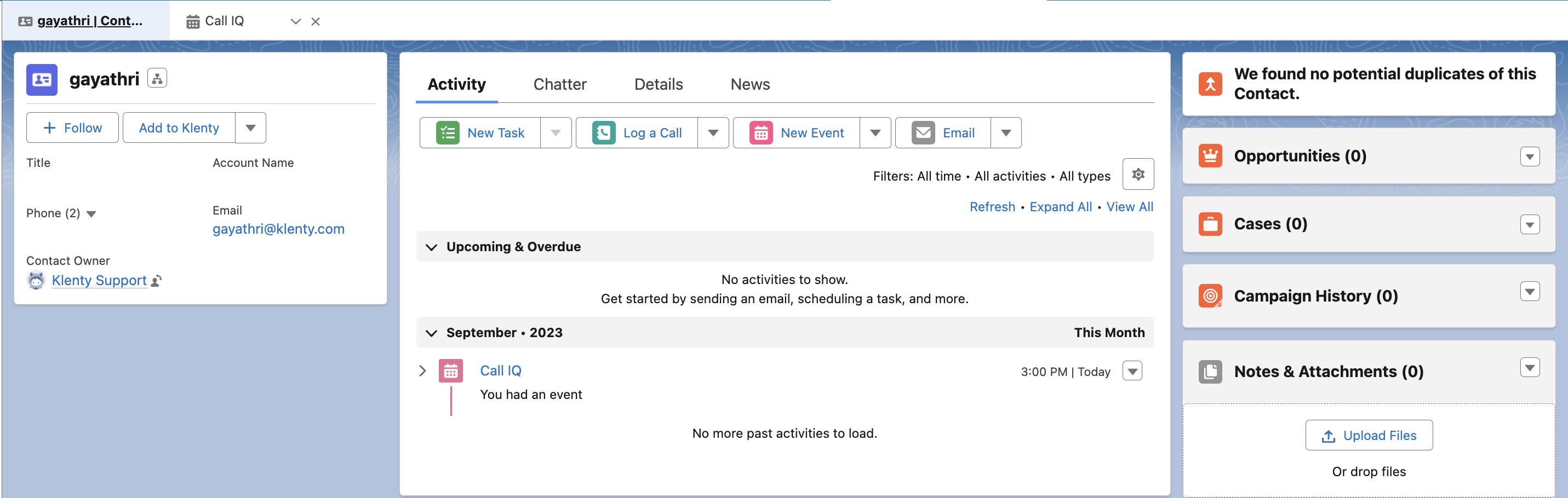 Call IQ has the ability to sync the meetings and the calls made from Klenty to the Lead/Contact module in Salesforce.