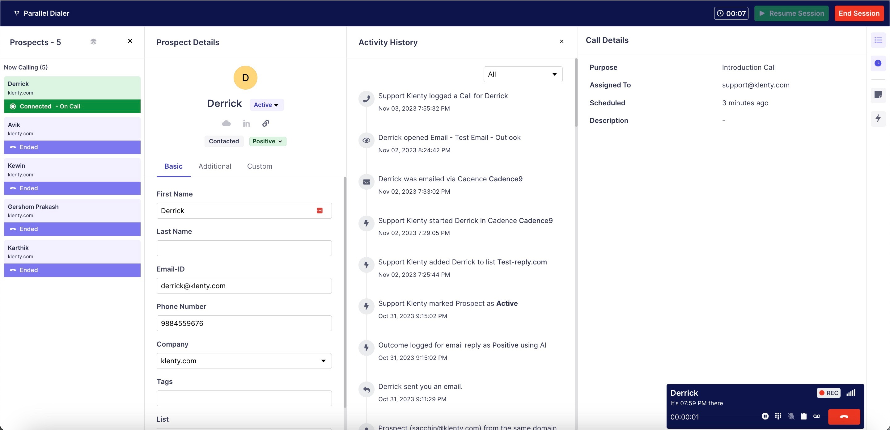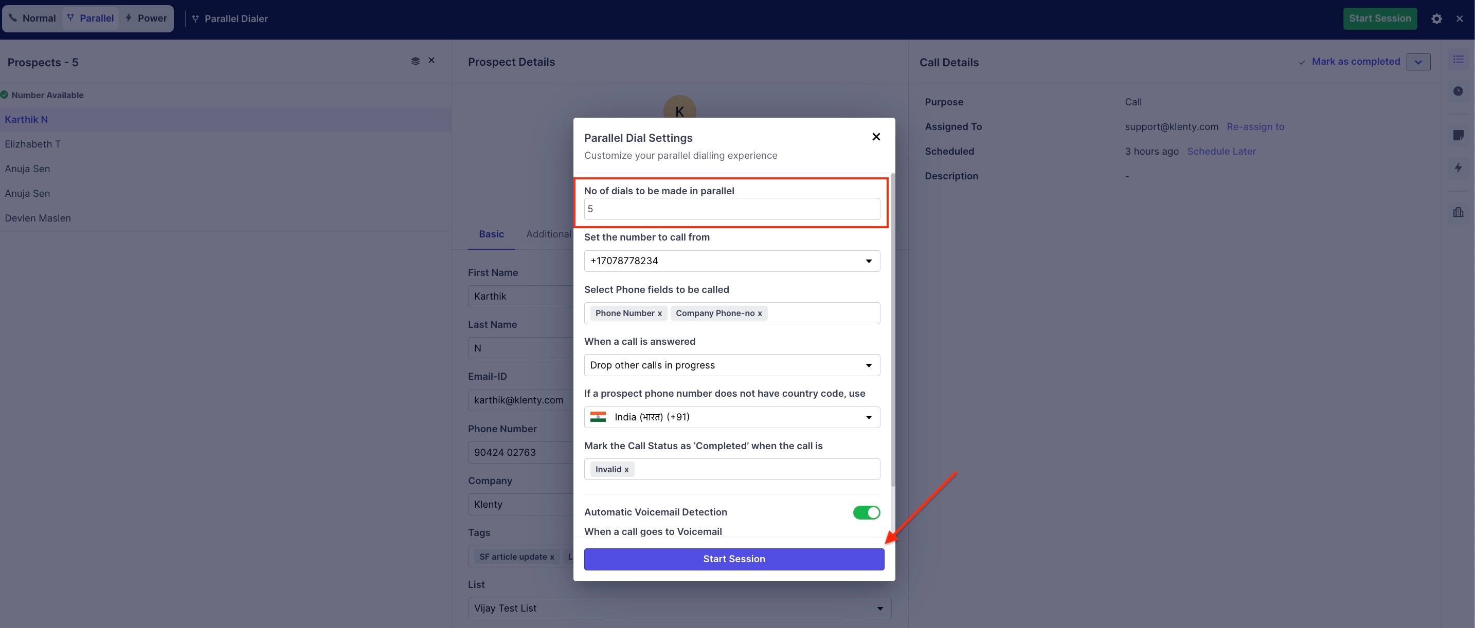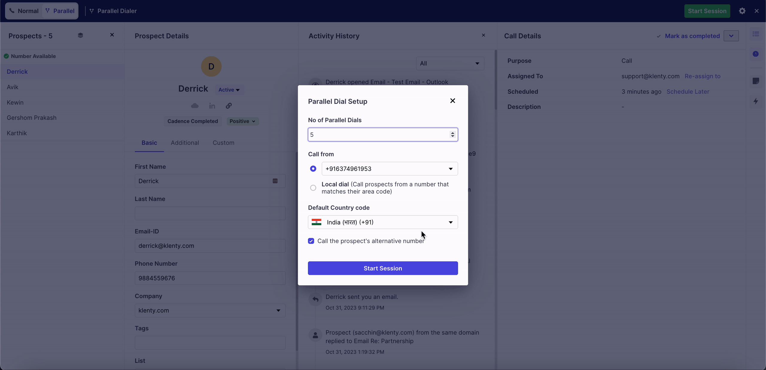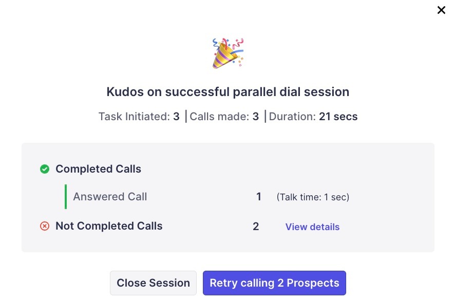 In Klenty, you'd be able to call 5 prospects at a time and start the session at a minimum of 2 calls at a time, where if one picks up the call, the rest of the calls will end and will only resume if you proceed to resume the session for the next batch of prospects.