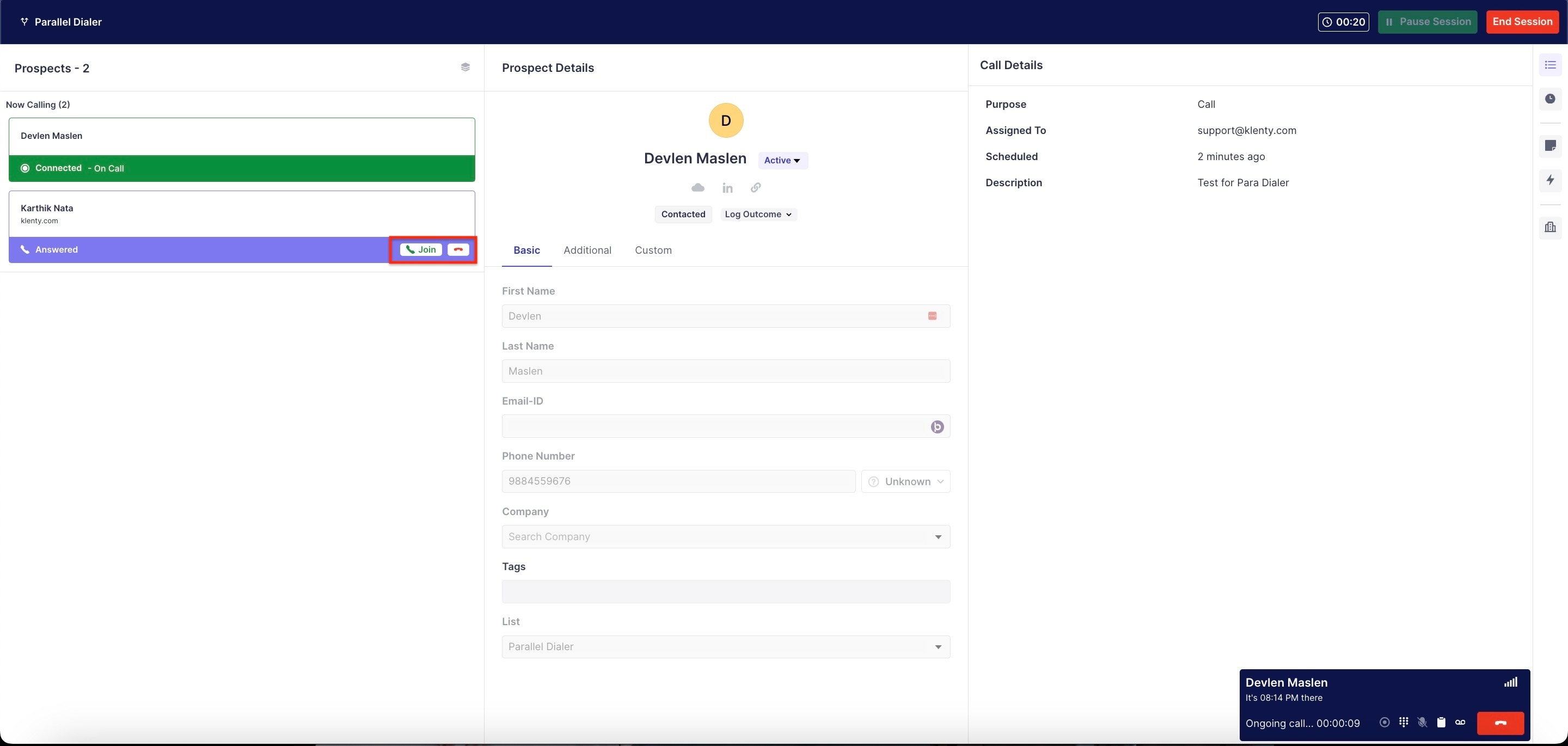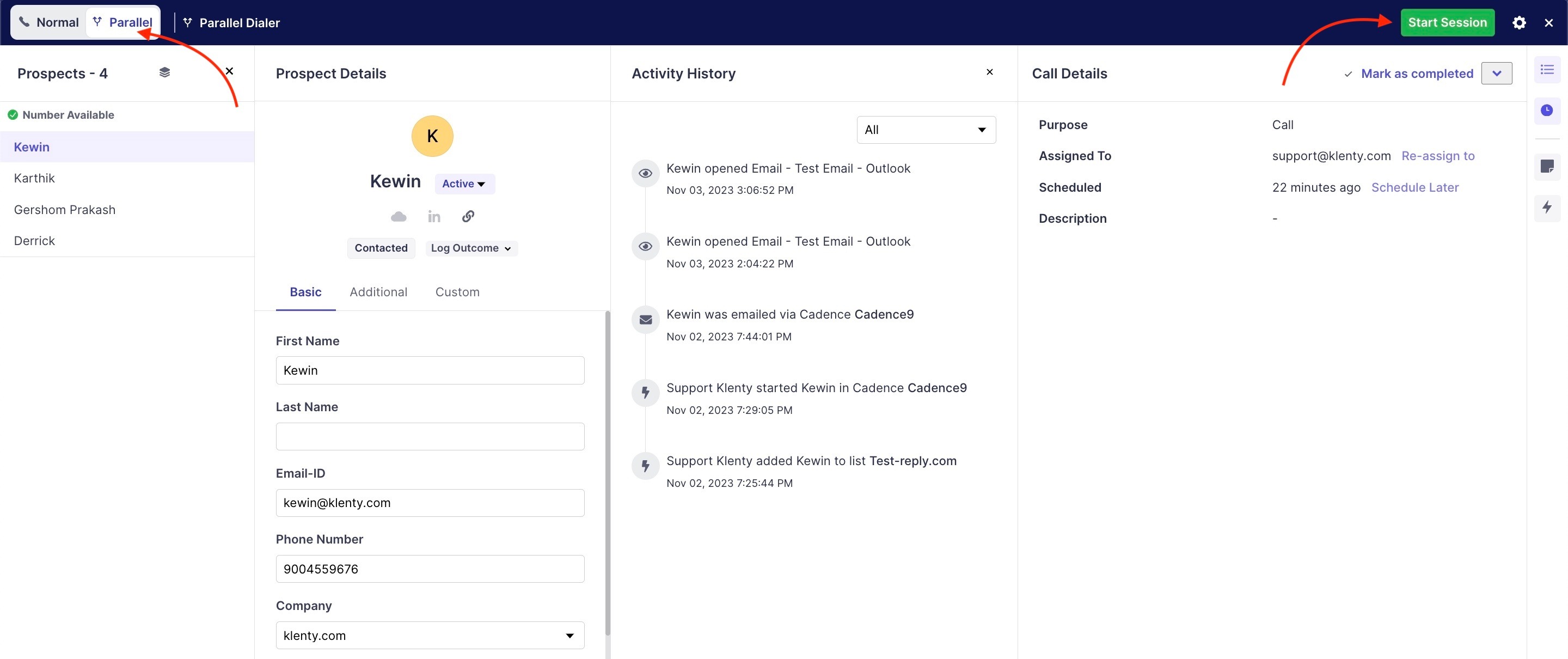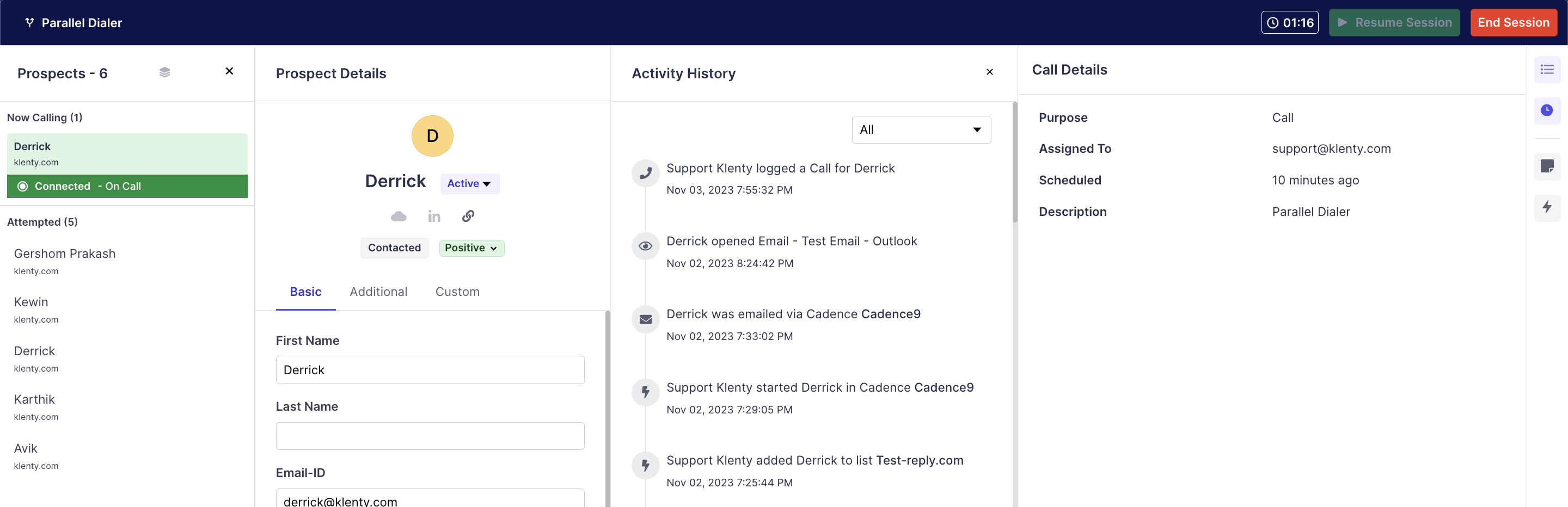 In Klenty, you'd be able to call 5 prospects at a time and start the session at a minimum of 2 calls at a time, where if one picks up the call, the rest of the calls will end and will only resume if you proceed to resume the session for the next batch of prospects.