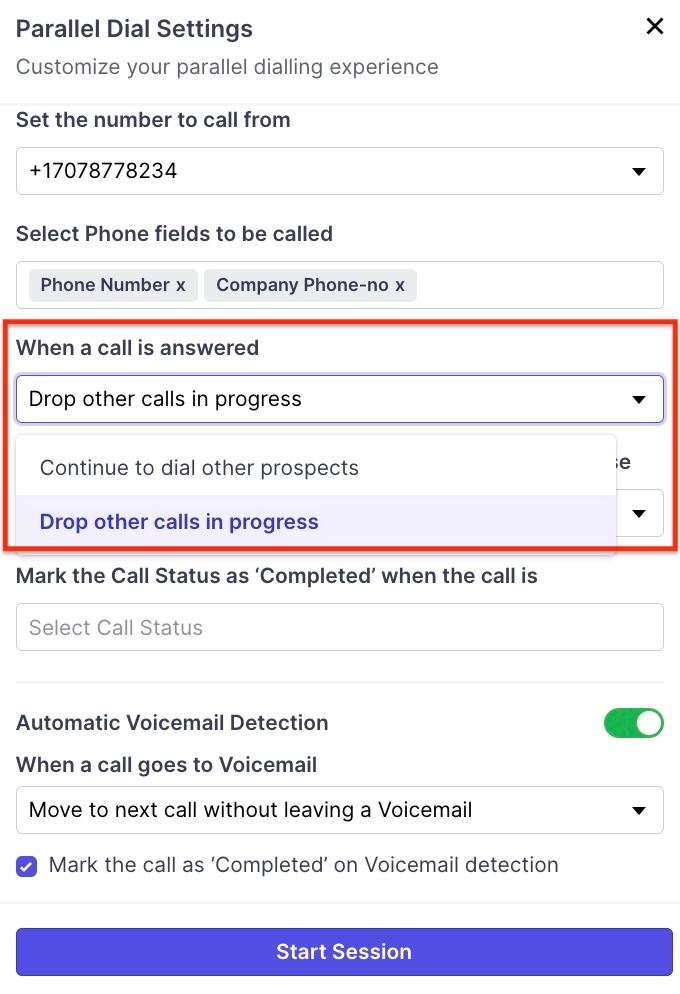 When you click on start session, you will be able to choose the number of calls you'd like to dial using the dialer along with the option to dial out from the number of your choice and an option to perform local dial that matches the prospect area code.