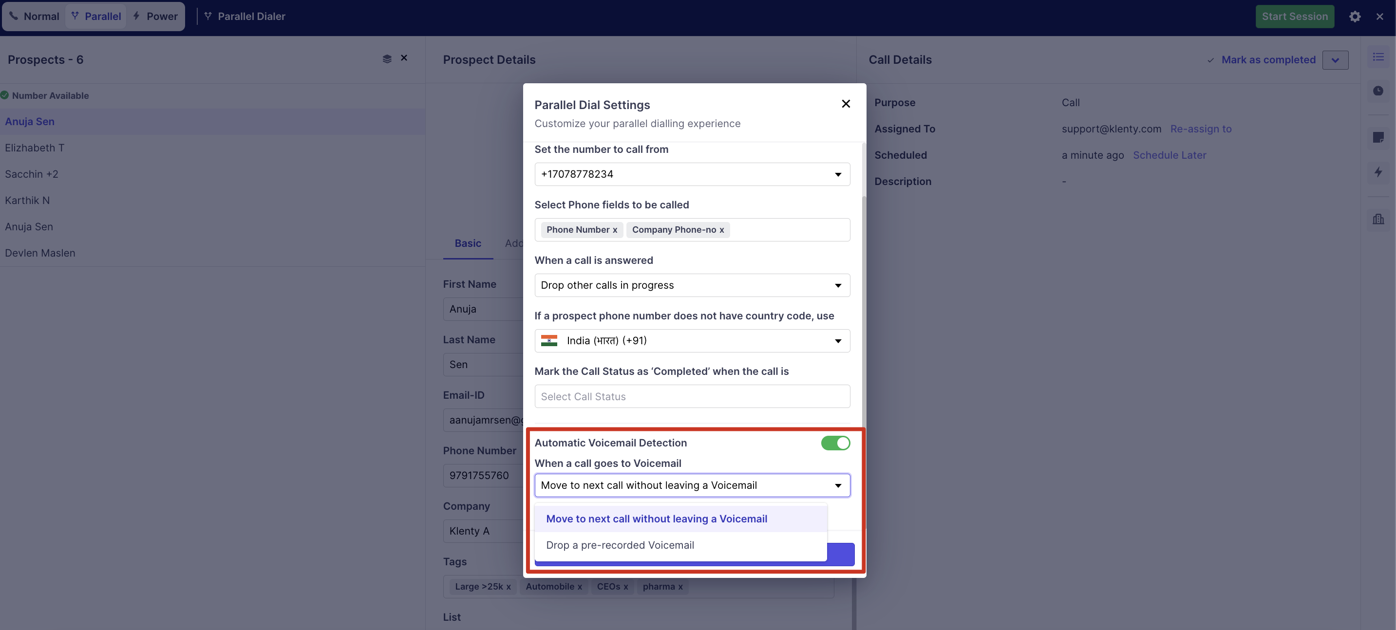 Automatic Voicemail Detection – Upon a call dialling out and once it moves to the prospect's voicemail; the Parallel dialer will detect the voicemail of the prospect and drop a message after the beep automatically.