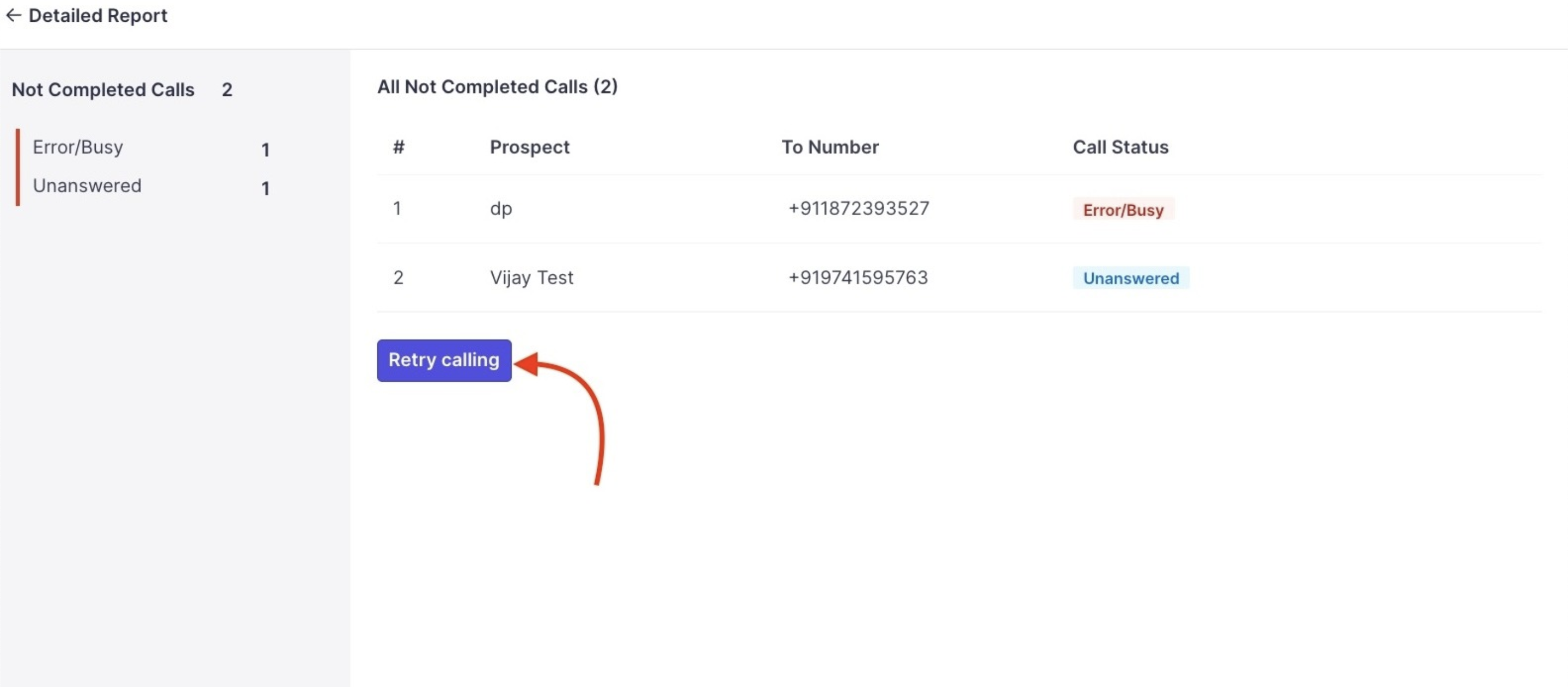 In View details for Not Completed Calls, you can see the reason the calls were not connected and retry the calls as well.
