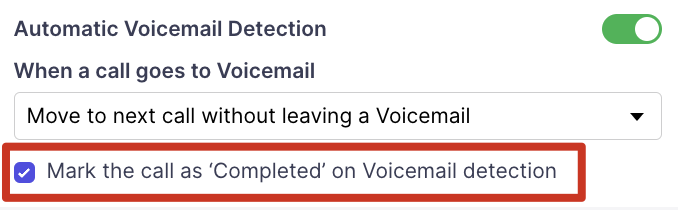 For dropping voicemails to your prospects you can mark them as completed by having the check box intact so that your calls will be marked completed when Voicemail is detected.