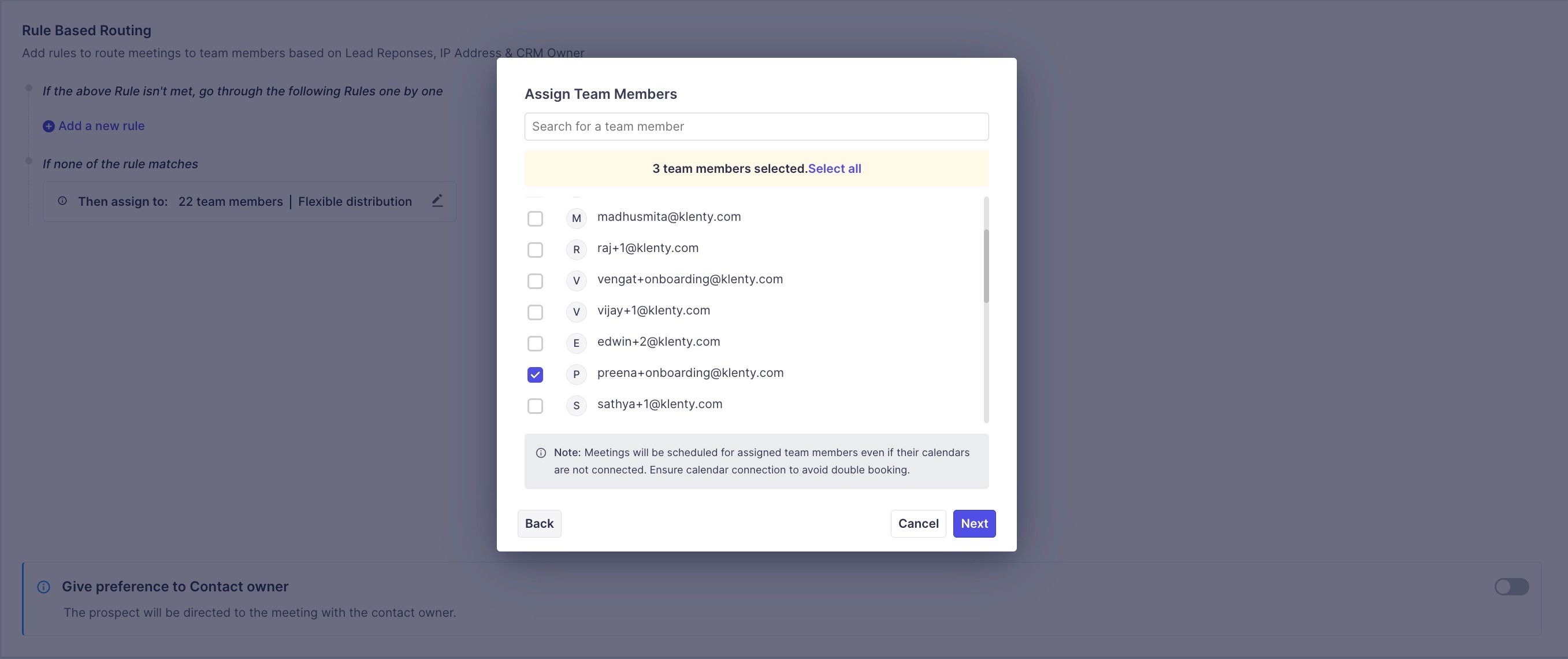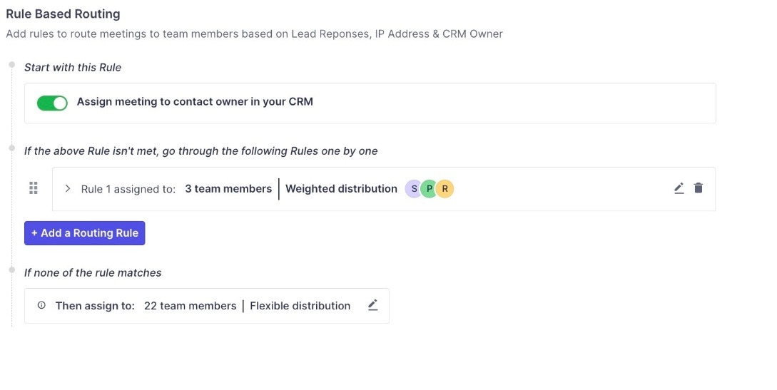 As a fallback back you also get to assign these meetings if none of the rules matches as flexible distribution where you can assign team members from the options and confirm the changes and additionally, you can prefer the meeting to be scheduled with a specific representative based on Contact ownership as well.