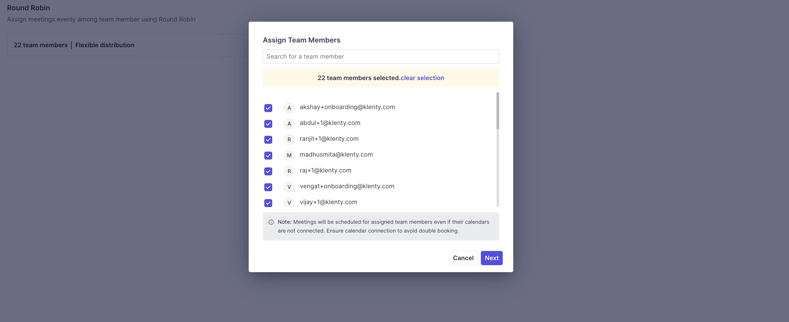 Round Robin Routing in Klenty evenly distributes leads or tasks among a team or group of users, ensuring each member gets an equal opportunity to engage with prospects or handle meetings in a systematic and fair rotation.
