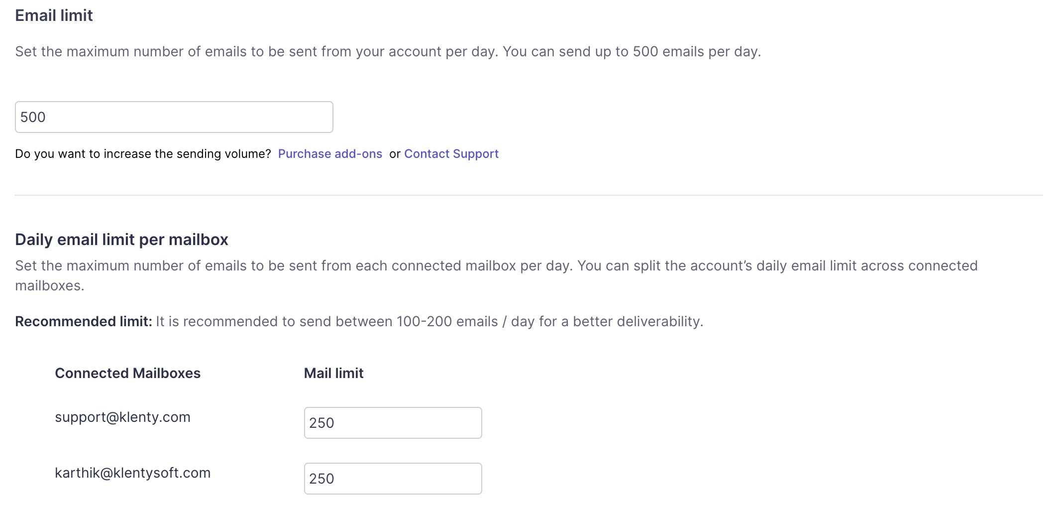 To set up daily limits for each mailbox, use the Daily email limit per mailbox setting.