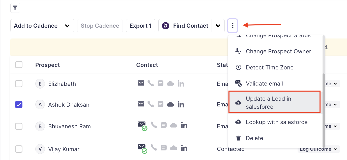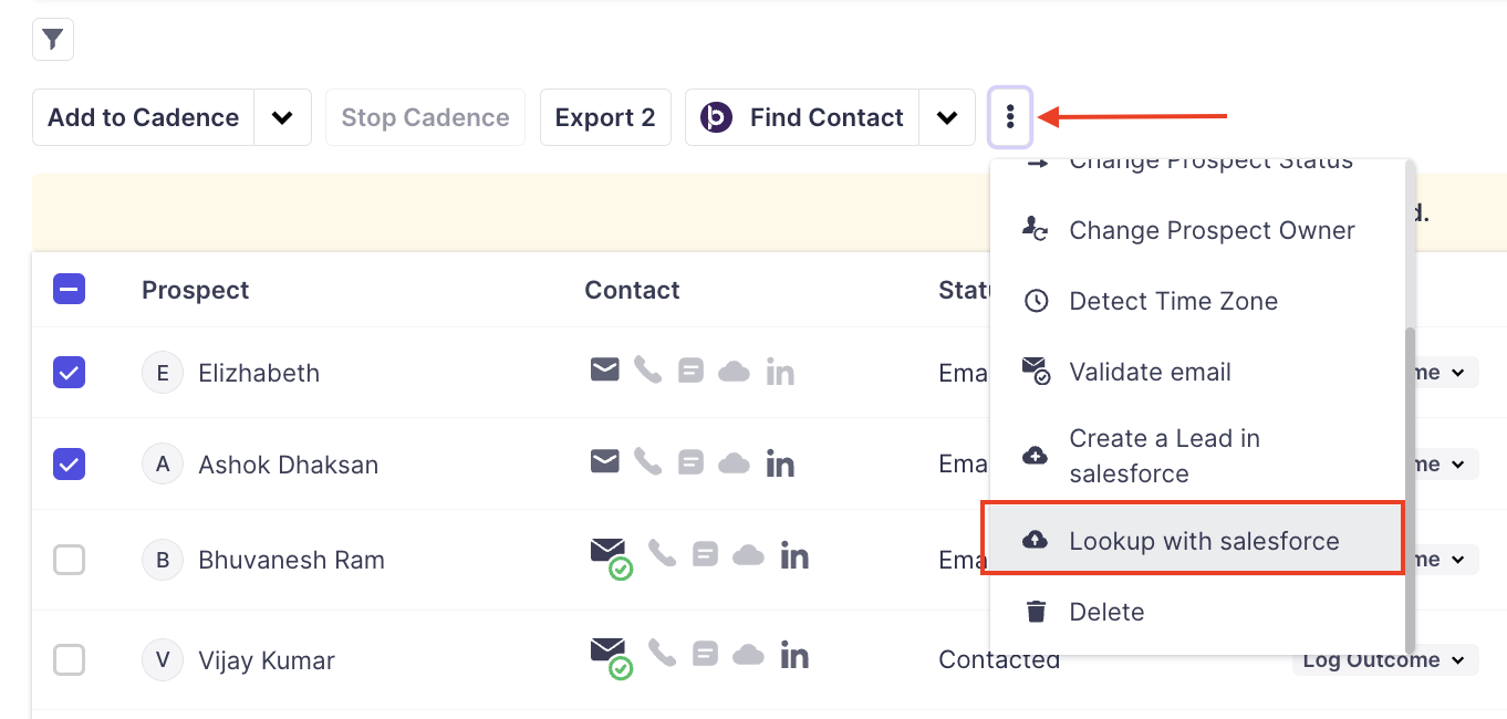 If a prospect is not already synced and you would like to manually sync the prospect, select the prospect --> Choose 3 dots and select "Lookup With Salesforce"