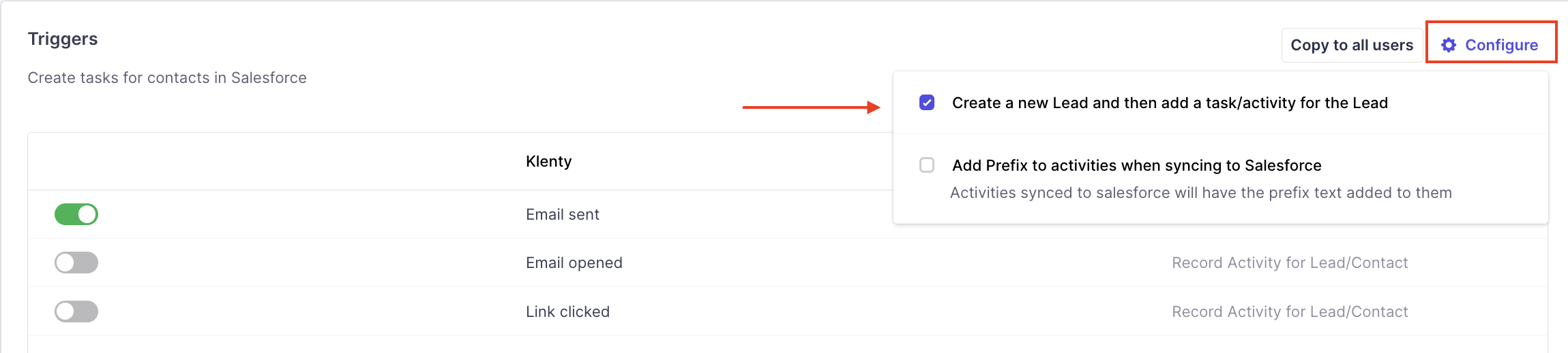 Based on your triggers set up, you can choose to create a new Lead in Salesforce CRM. If the Lead is not available in your CRM, before creating an activity Klenty will create a new Lead and then record the activity.