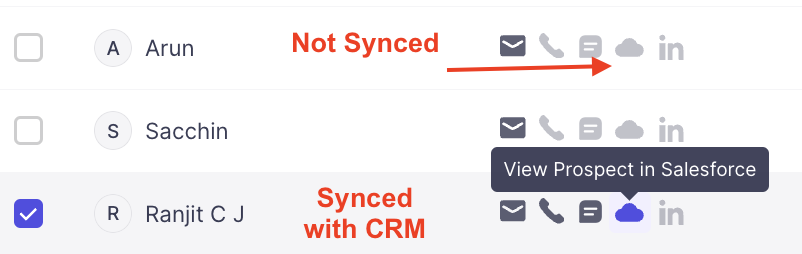 If your prospect already exists in your CRM and synced with Klenty, you can find the cloud icon highlighted in the prospects page as shown below