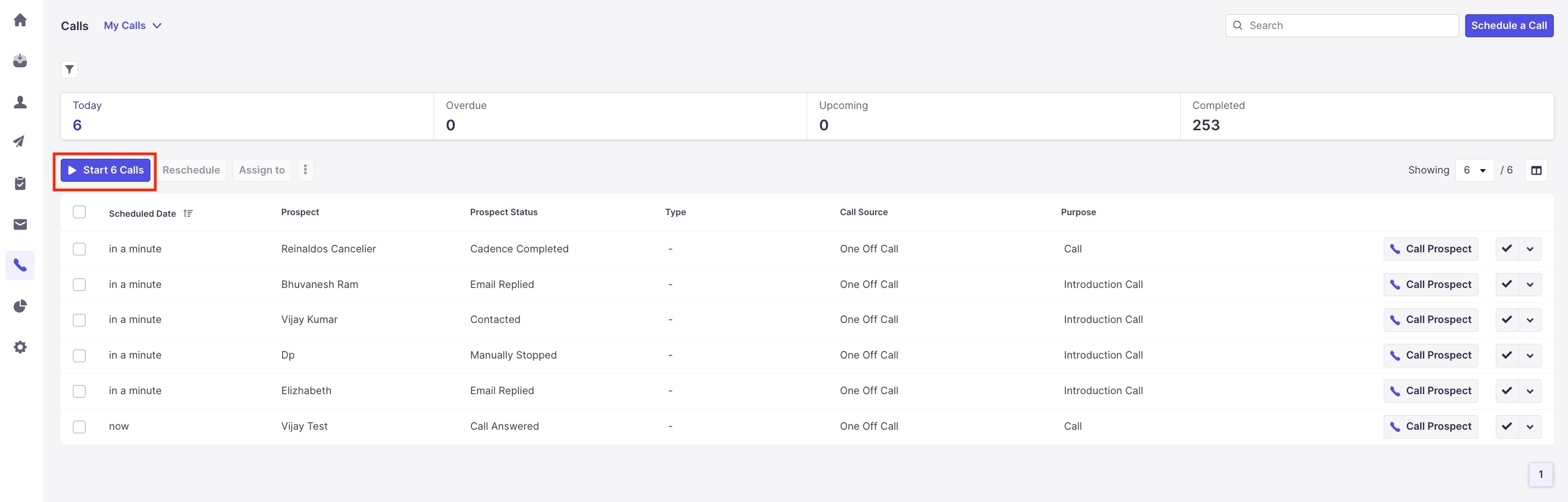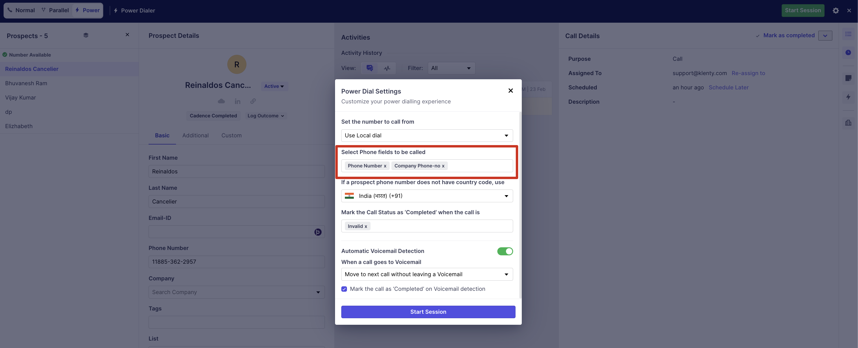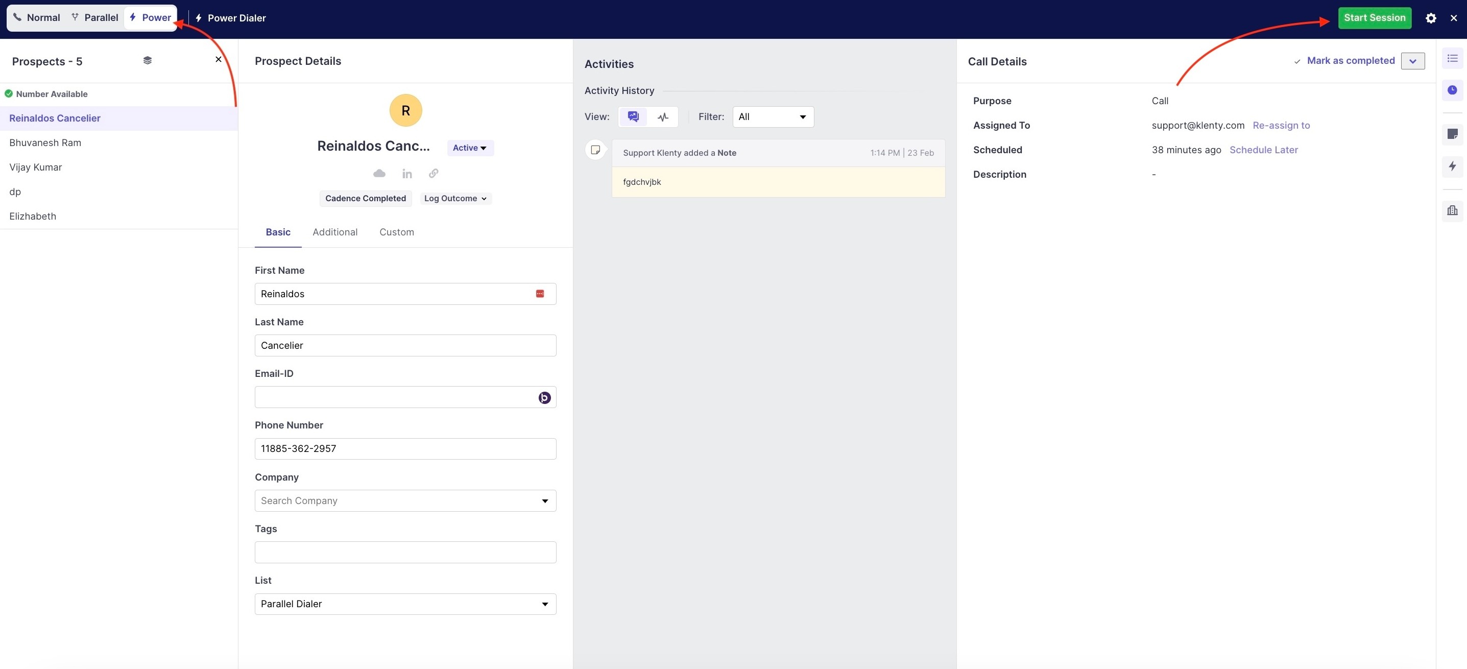 Once you start the scheduled calls, you will have the option to choose between Normal, Parallel and Power Dialling where you'll need to select the option of Power Dialling and Start the session.