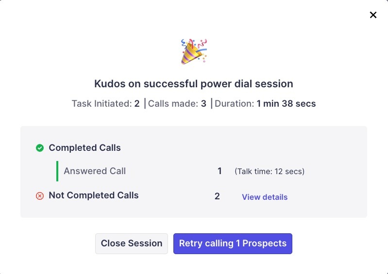 Once a session is done, you will be presented with stats from the session, including the number of calls made, time spent, and the option to retry calls that were not connected.