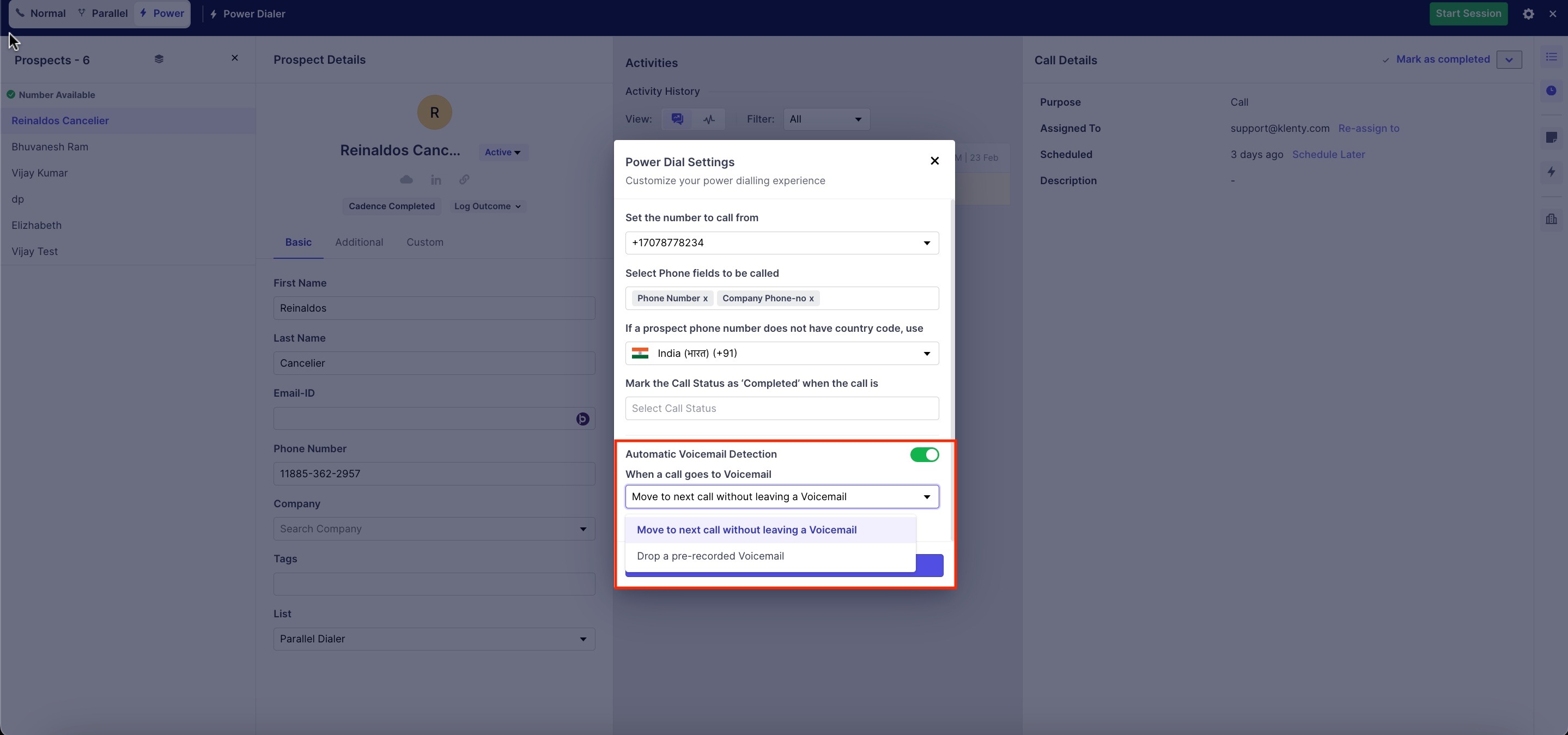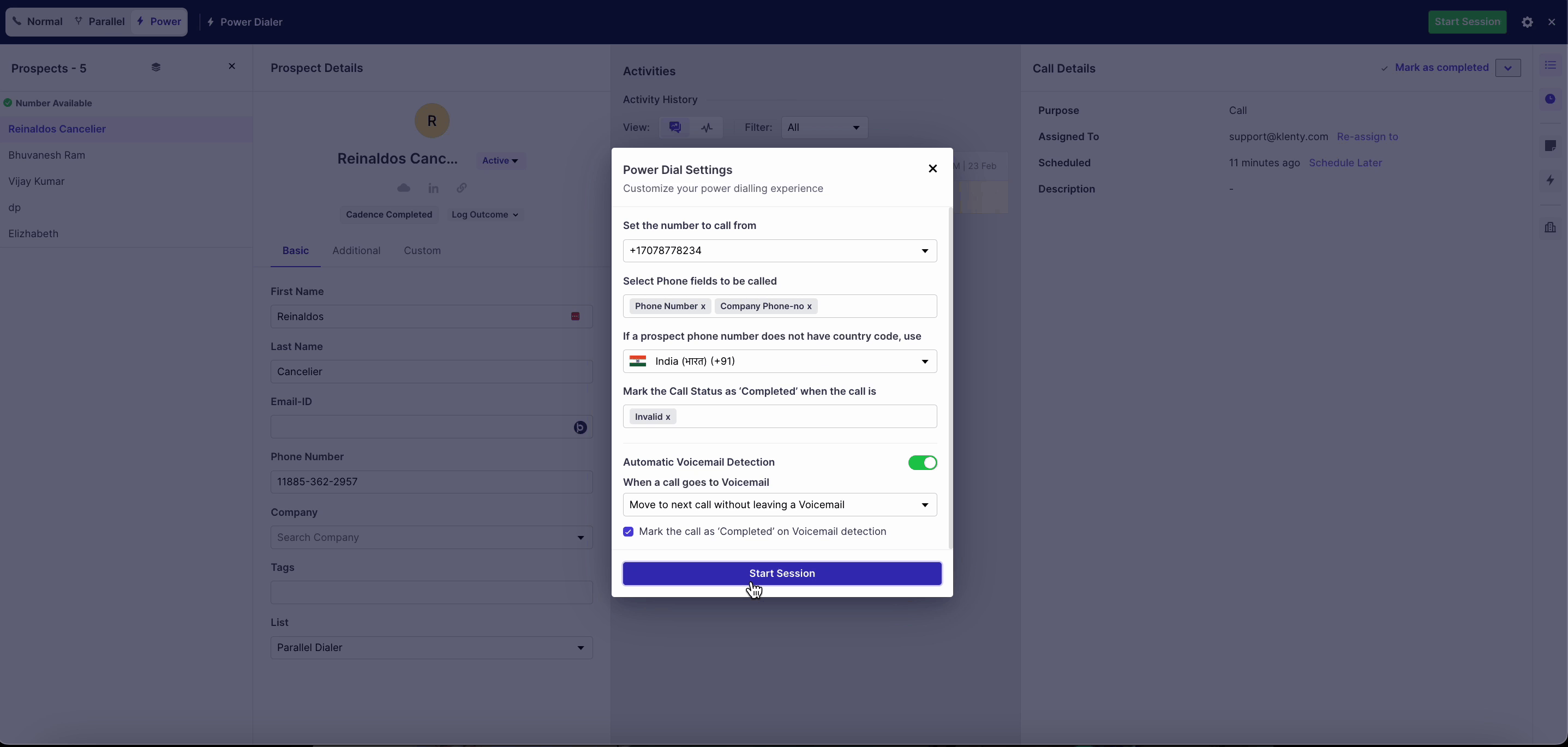 In the Power Dialer mode, Klenty places the calls for you automatically. Once you complete a call, the dialer automatically moves to the next call.