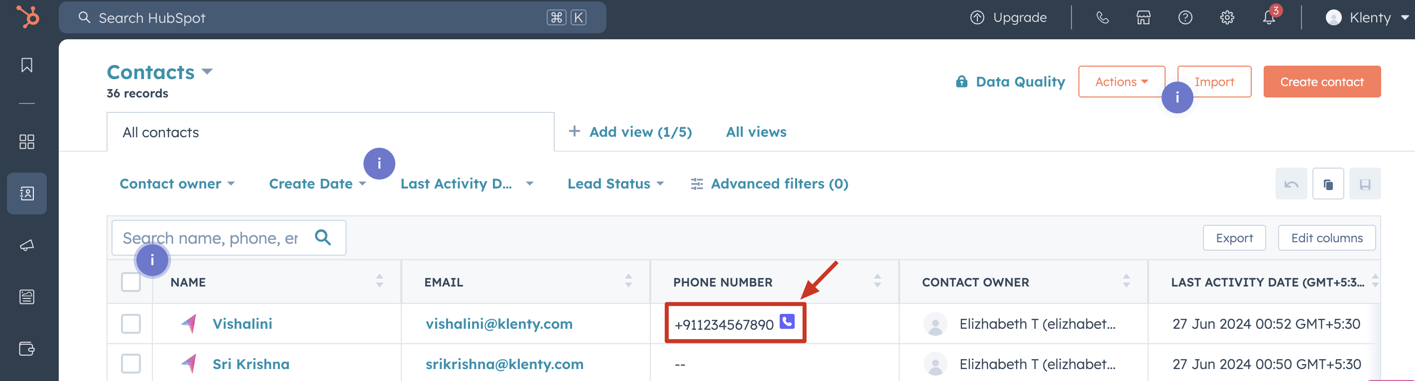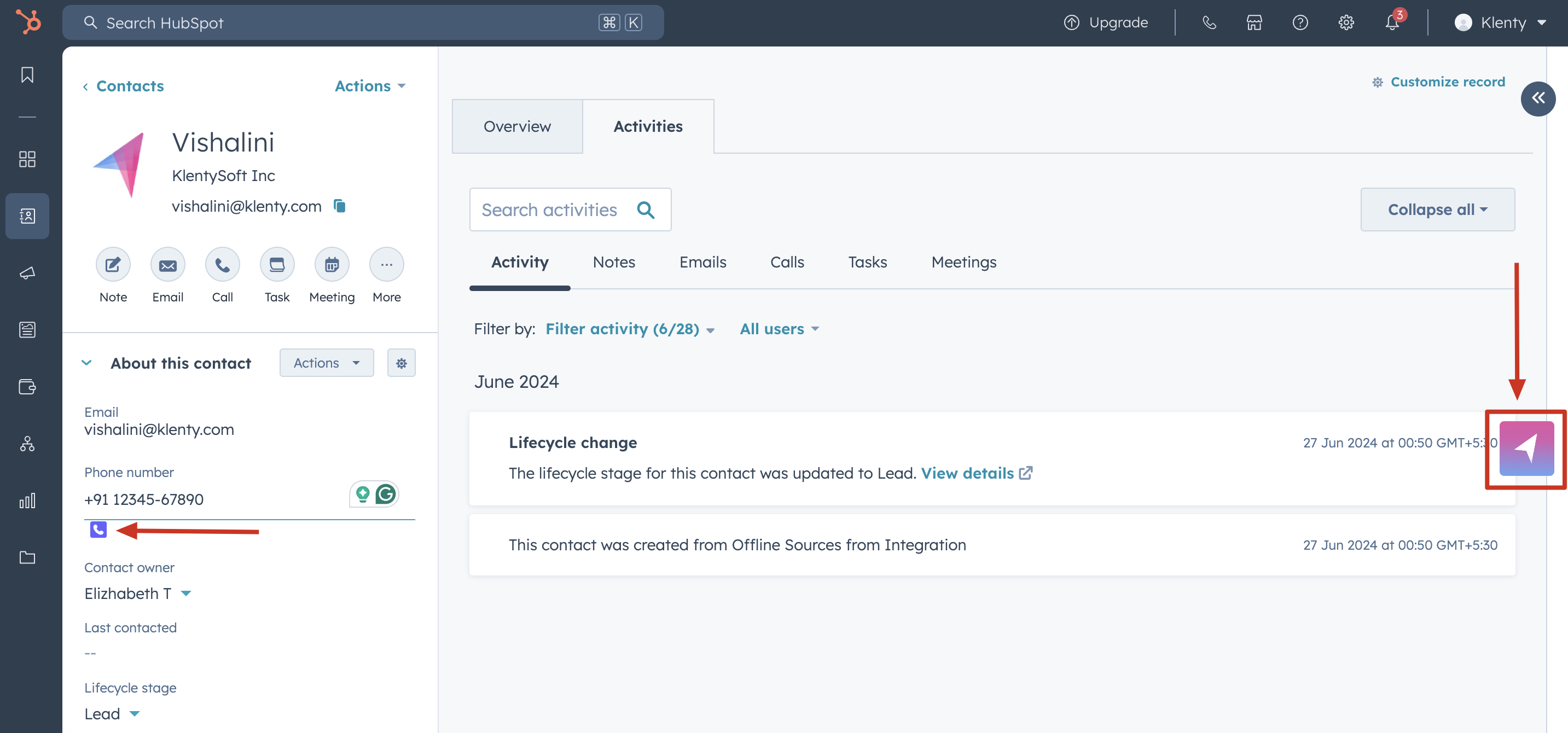 In HubSpot, open a Contact or List to find the Klenty icon next to the phone number field. This floating dialler is used to make a one-off call to pull up the dialler.